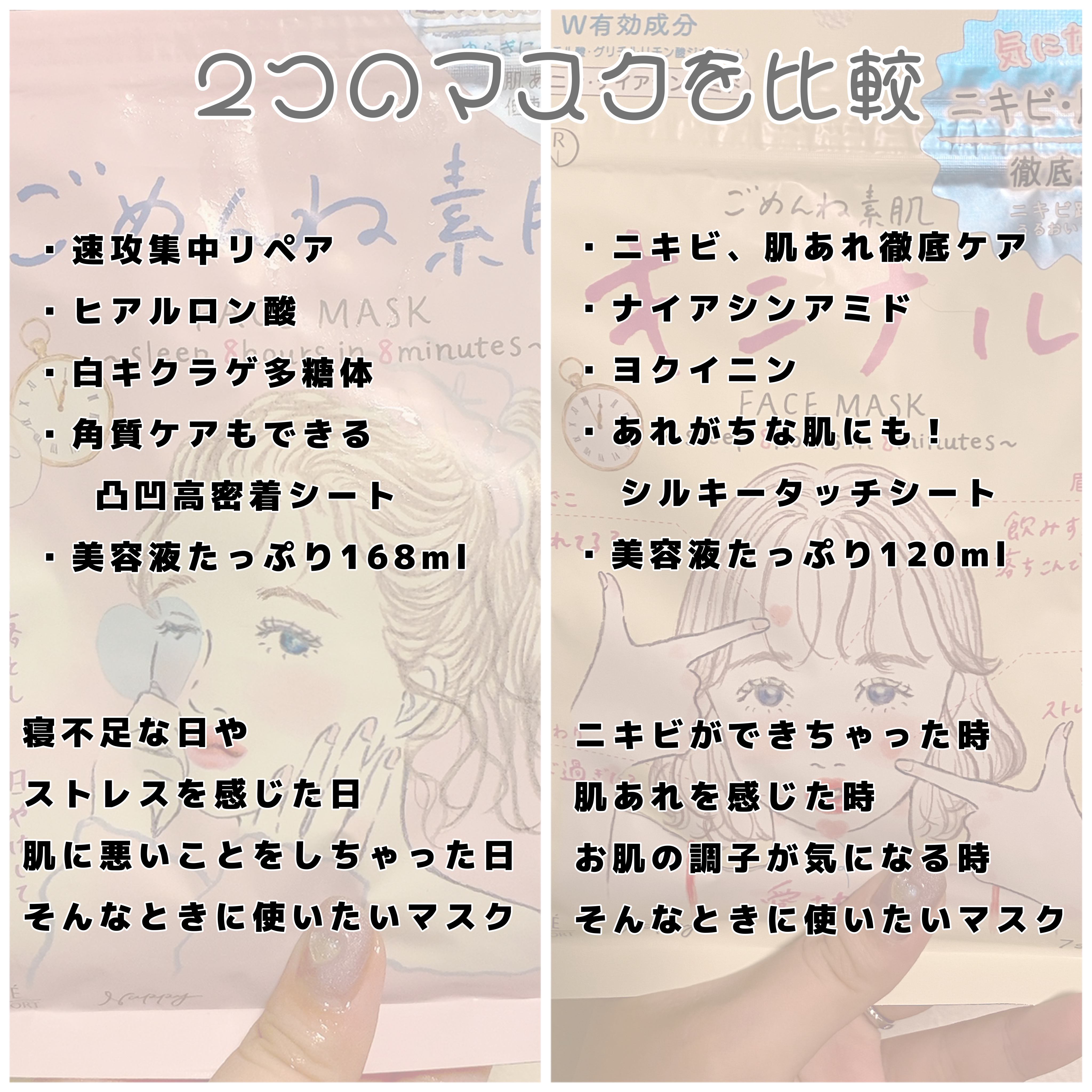 全部使い切ったけど、正直に言うと、うーん…って感じ この金額ならもっといいマスクあるよね…? 使用感大事な私は、このパックの素材がそもそも合わなくて、パックつけた時の気持ちい〜って感じが無いのが残念 唯一キニナルマスクは着け心地割とすきだったんだけど、これをつけてる時だけ何故かTゾーンがめちゃくちゃ乾燥して 鎮静に特化してる分、保湿はイマイチだったのかな、と感じました 絵とか可愛くて買った時はテンション上がるけどリピはないかなあ…