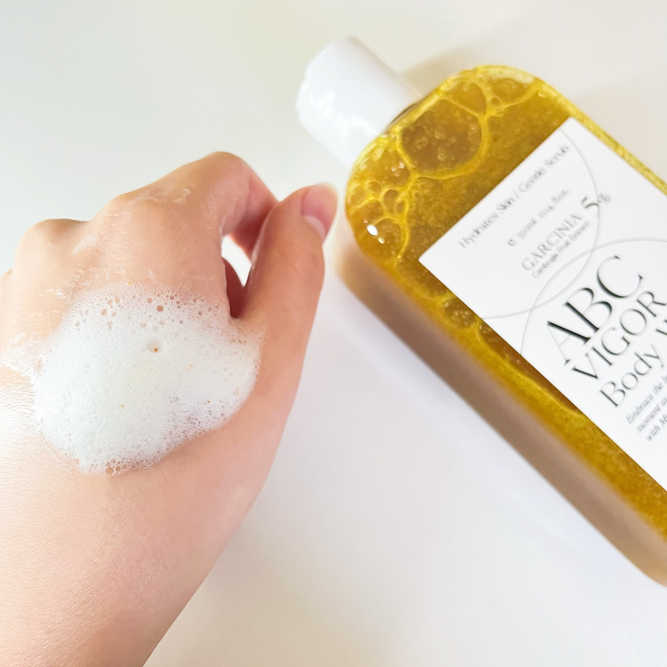 スクラブには自然由来の胡桃や大豆、米粉、緑豆種子を使用したマイルドスクラブで、ジャリジャリし過ぎないで優しいスクラブです♡ ガルシニアエキス配合で一時的にセルライトを緩和し弾力のある肌へ仕上げてくれます。 洗い上がりは滑らかつるん✨✨ 油分でツルッとしてるというより、汚れやいらない角質がとれてツルッとする感じがします。 特に日焼け止めを重ねて塗ることの多い、首・デコルテ、腕はよりツルツルになったなーと感じました。普段のボディウォッシュだけでは落ち切らない汚れや角質があったみたいです😱💦