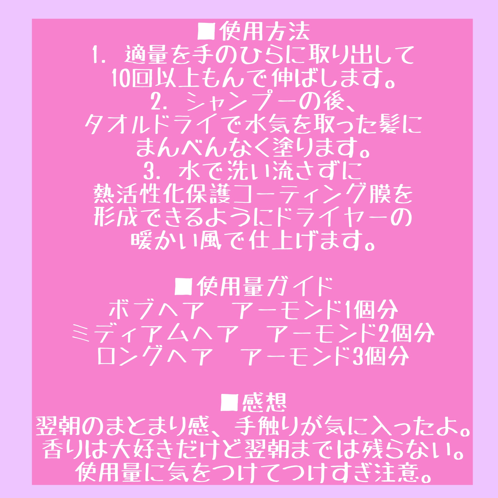 | ヘアケア・スタイリングランキング第42位 | 透明でとろっとしたテクスチャーで髪に伸ばしやすくしっとりツヤ感 でもドライヤーのあとはさらっとしています。 | 詳細を見る | |