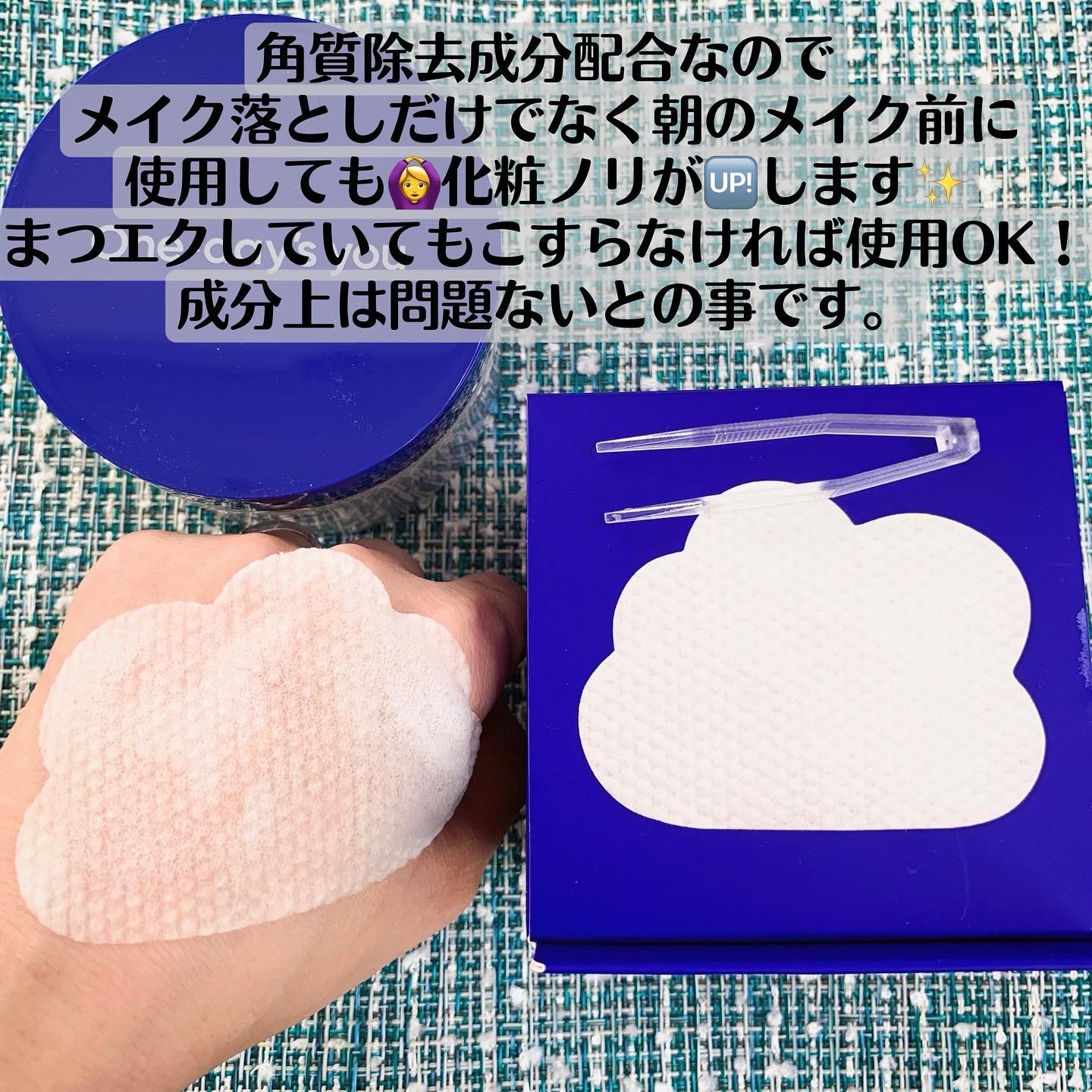 メイク落としシートよりも貼ってメイクと馴染ませやすく 小さいので折りたたんで目のキワや小鼻のメイクも 落としやすくてオススメです 液をたっぷり含んだ可愛い雲形パッド☁️💕 肌に乗せておくとジュワッとメイクと馴染んで 擦らなくてもするんと綺麗にメイクが落ちます! ティントやウォータープルーフのアイライナーなどは 1発で!とはいきませんでしたが、くるくる馴染ませるだけで スッキリ綺麗にメイク落ち✨✨