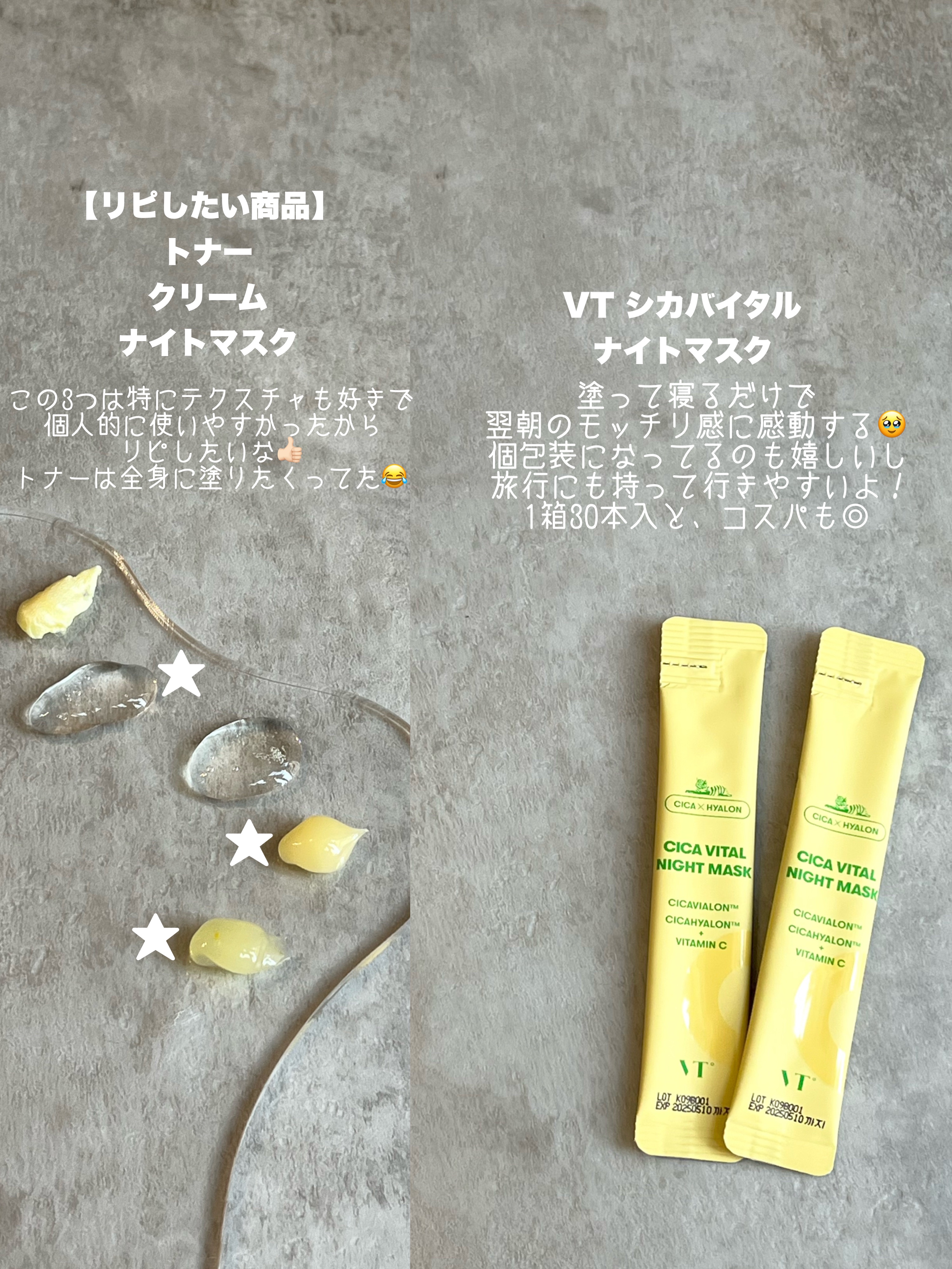 ゆず×CICAでぽんっと弾ける輝きに満ちたツヤ美肌へ◻️VTシカバイタルクリーム¥2,730(税込)VTの黄色パケといえばゆずビタ×CICAのシカバイタルシリーズ!整肌成分CICA(ツボクサエキス)とハリ保湿のユズ種子エキス配合。乾燥によって...