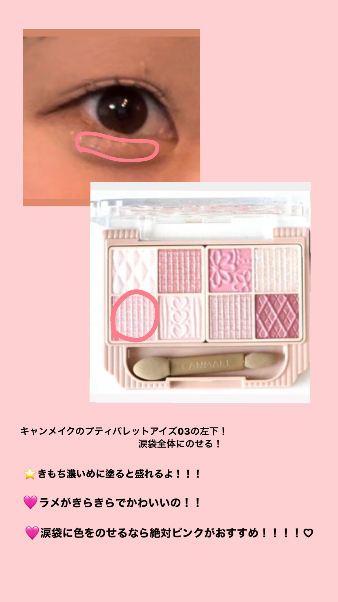 カバー力はいまいちかな💧💧けど密着力はすごく感じてよかった✨️ そしてぜんっぜん乾燥しない!!! 長時間たっても乾燥したり、浮いてきたりはしなかった!!!感動😭 コスパやばいよ!!💦最高すぎる 捨て色がなく、全色使いやすくてかわいいの🎀 細かいラメのアイシャドウがおおく、涙袋メイク好きの方にぜひぜひおすすめしたい!! 03はブルベの方におすすめだよ!けどもちろんイエベの方も全然いける!!☆ 付属のチップも使いやすい👍🏻欠点はないです!笑