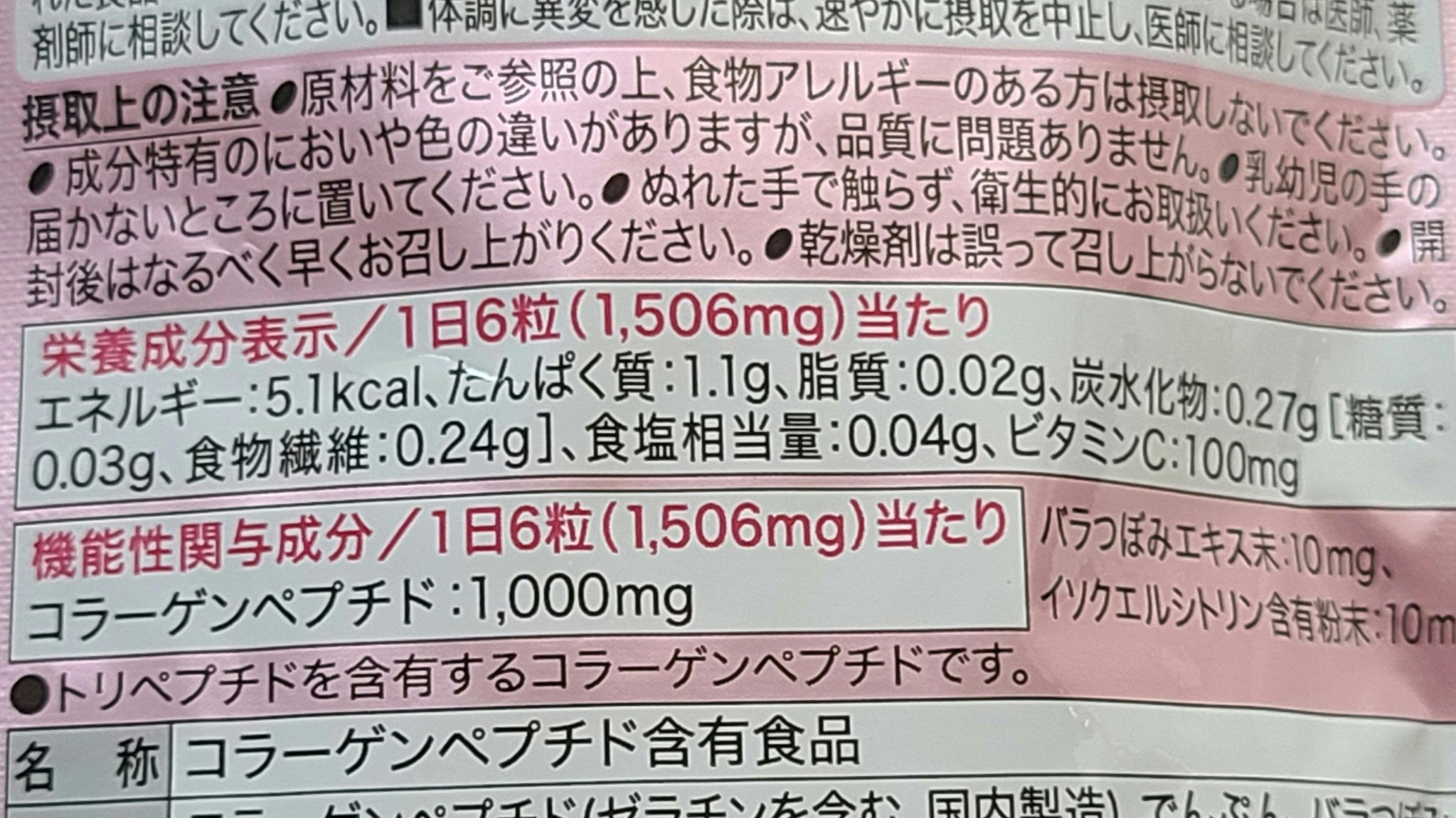- <ディープチャージ コラーゲン> コラーゲンペプチド(国内製造)、でんぷん、バラつぼみエキス末、イソクエルシトリン含有物、セルロース、ビタミンC、微粒二酸化ケイ素、ステアリン酸カルシウム、環状オリゴ糖、シェラック