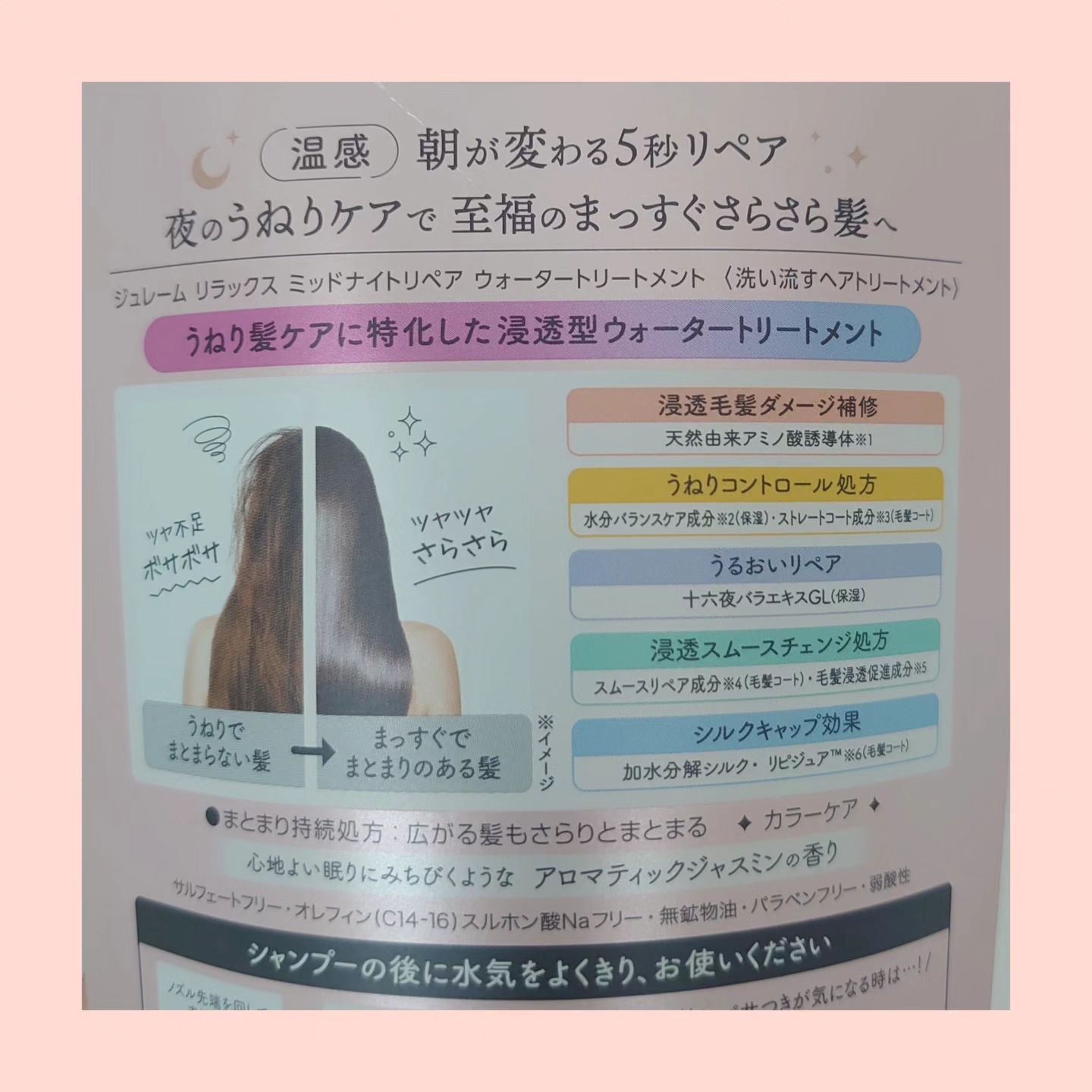 - しみ込む しみ込む うねり髪の夜美容 朝が変わる…!さらさらストレート髪へみちびくウォータートリートメント ●うねりケアに特化したウォータートリートメント 液状なのにつけた瞬間とろり密着、すーっと浸透。指どおりの良い至福のまっすぐさらさら髪へ ●心地よい眠りにみちびくような アロマティックジャスミンの香り