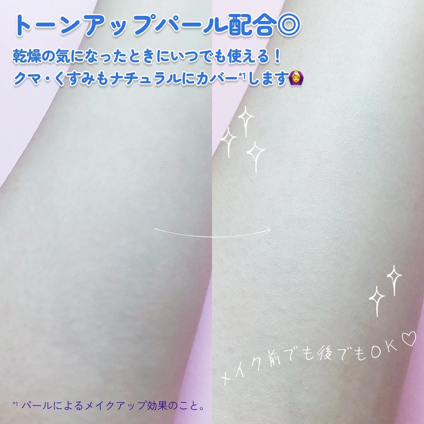 トーンアップパールが、しっかり入っているので、スッピンに塗ると、目の下だけ、テカテカに見えなくも無いですが、少量で済むし、コスパ良くて良いです。 敏感肌対応、低刺激処方な所もよくて、痒くなったりせずに使えています。