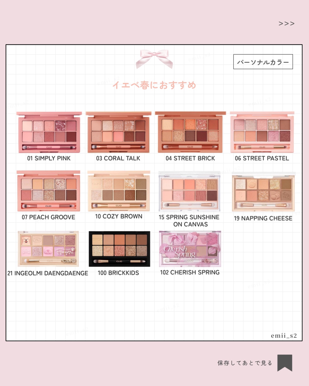 【2025年最新版】大人気CLIOの全アイシャドウをパーソナルカラー分類🌷保存推奨です🕊️\現時点で全64色/ミニサイズや新色が出た時は、この投稿に追加します!🗒️参考になれば嬉しいです♡CLIOプロアイパレット01SIMPLYPINK シン...