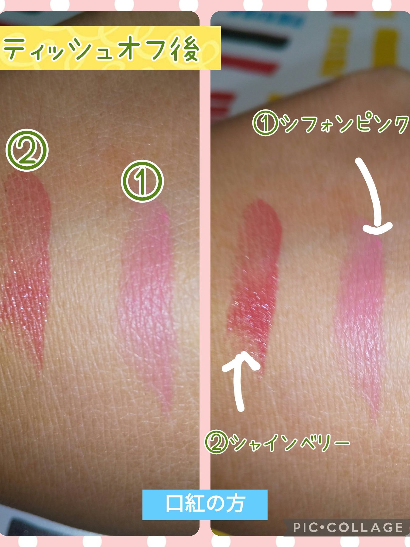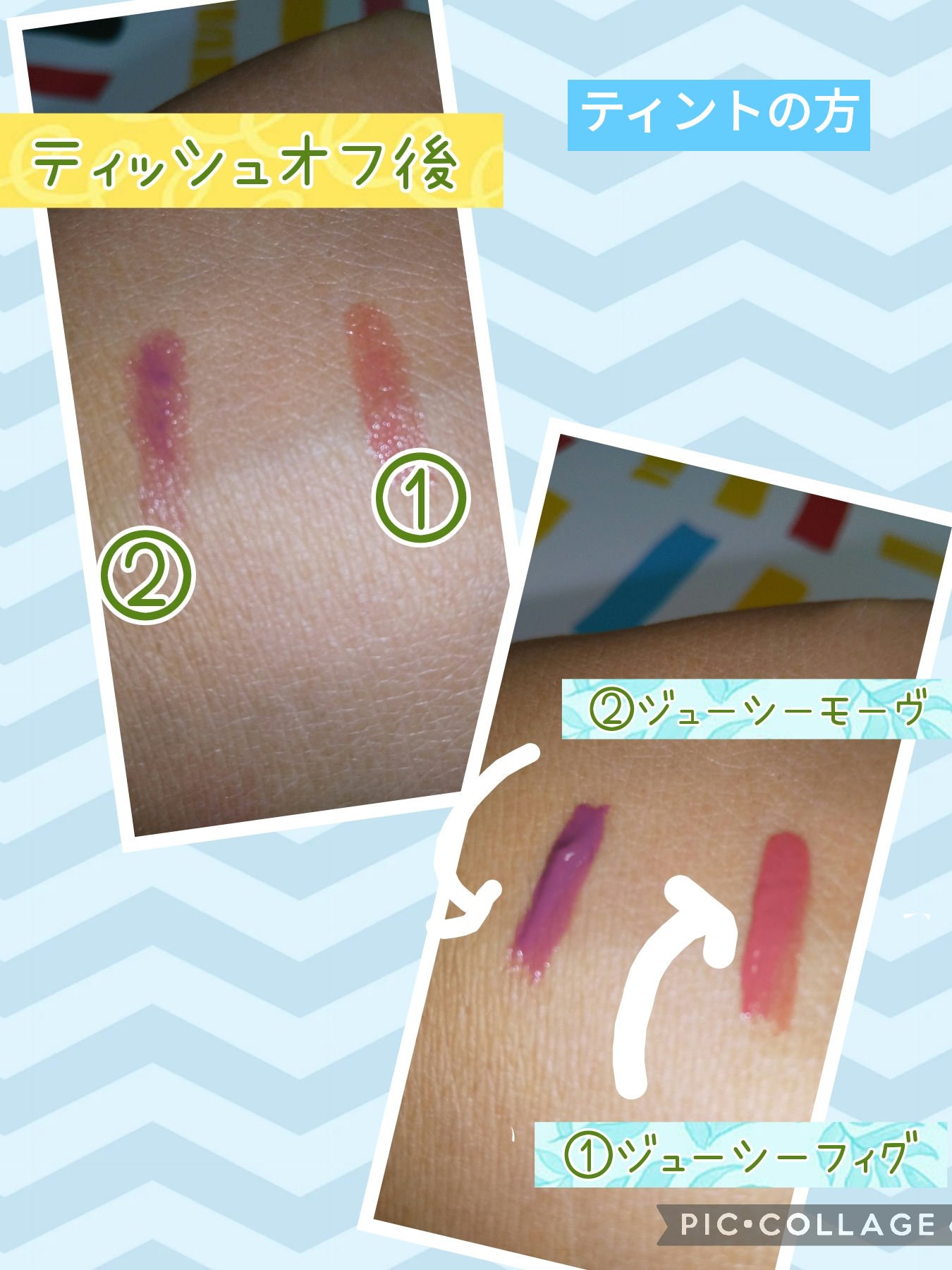 まず気に入ったのは艶やかで肌馴染みの良い仕上がり。 ティントってややもするとべったりとした色味だったり😑つけた側からカサカサしちゃうもの😞もある中、これはいい感じでした😄 つけたてがとにかくキレイなのでコロナ禍じゃなければこの艶やかさを存分に堪能出来るのに💦 ティッシュオフすると自然な色味が残ります。 マスクにべったりつかないのは今のご時世助かりますよね😙 食事したあとはさすがに持ちませんが、全然許容範囲です。 06、07ともイエベの私には浮かない使いやすい色味でした!