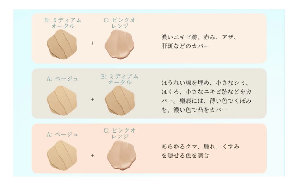 - 様々な肌悩みにアプローチして開発された三色一体型コンシーラーパレット。 3つのカラー、2つのテクスチャーがお悩み別にアプローチ、シームレスな美しい肌に仕上げる。パレットのカラーはクールトーンとウォームトーンを兼ね備えているため、メイク初心者の方でも色選びに悩まずにメイク可能。 さらに、右下部分に斜めのパレットが設計、パレットで3つのカラーを調合して使うことで自分好みの色を調合することができ、様々なお悩みを解決。