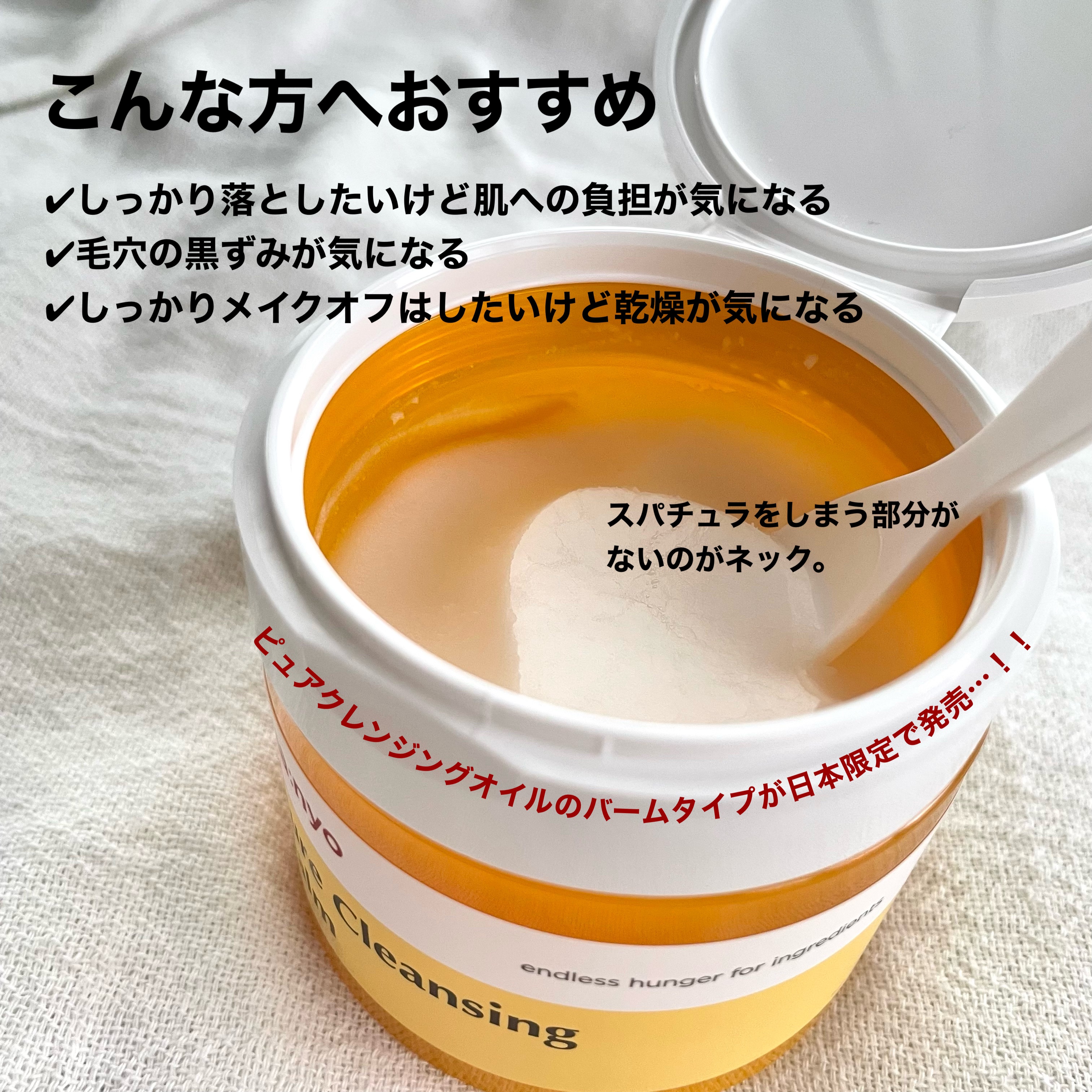 - 大人気ピュアクレンジングオイルのバームタイプが日本限定発売。 天然酵素成分※1し、お肌にやさしいつかい心地。毛穴汚れや老廃物をすっきりオフ。 体温ですっと溶けるシャーベットのようななめらかテクスチャーなので、お肌への負担を減らしたクレンジングが叶います。 保湿力に優れた14種の植物性オイル※2がディープクレンジング後もしっとりと保湿して、つっぱりにくいお肌へと仕上げます。 ※1パパイン(皮膚コンディショニング剤) ※2皮膚コンディショニング剤