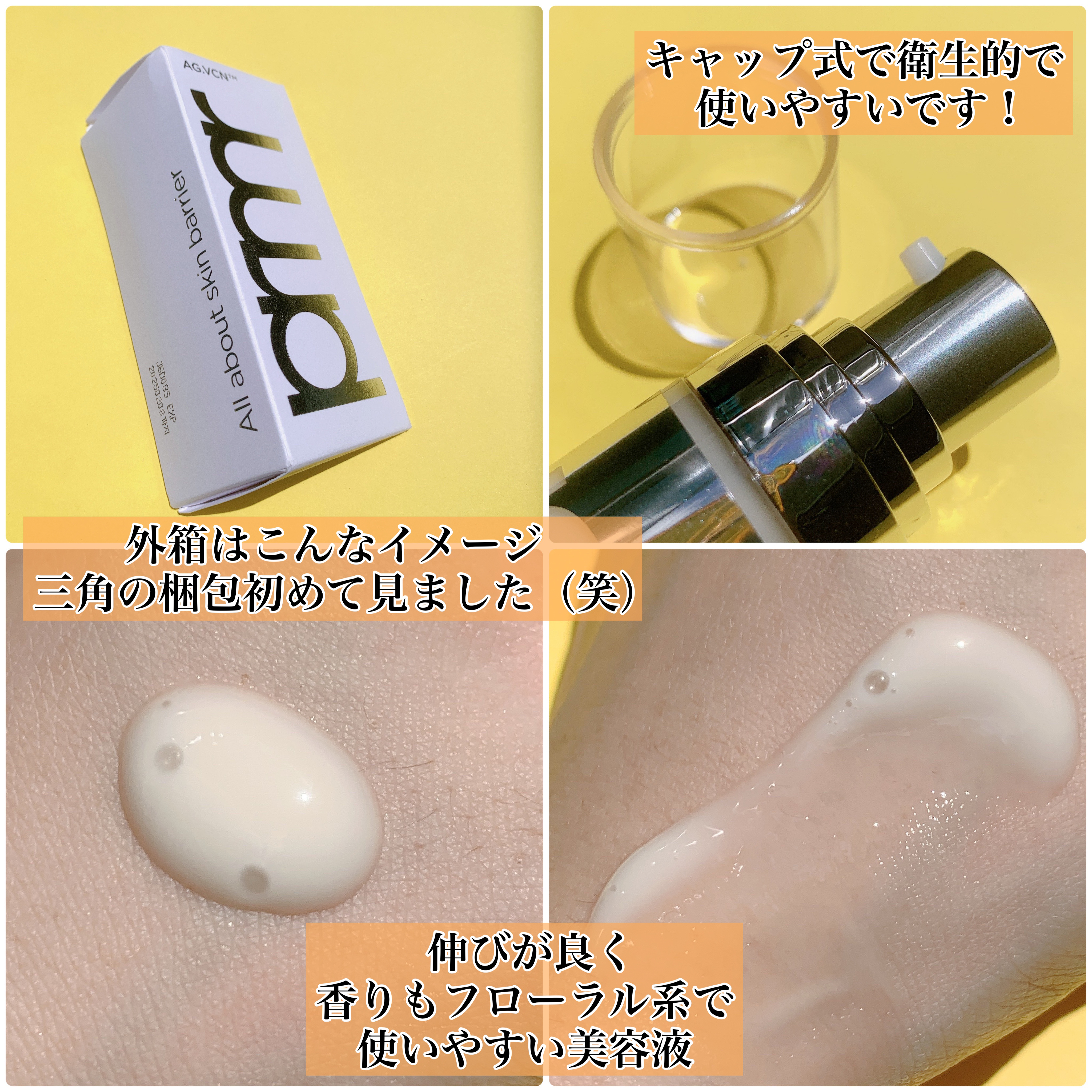 ビタミンCとレチノールが組み合わさったセラムになります。 柔らかく伸びのよいテクスチャーです。 カチッと音がするまでポンプを押すと内部からカプセルの入ったパーツが開きます。 開封後は3ヶ月以内に使い朝使用するときには日焼け止めが必要なので注意が必要です。