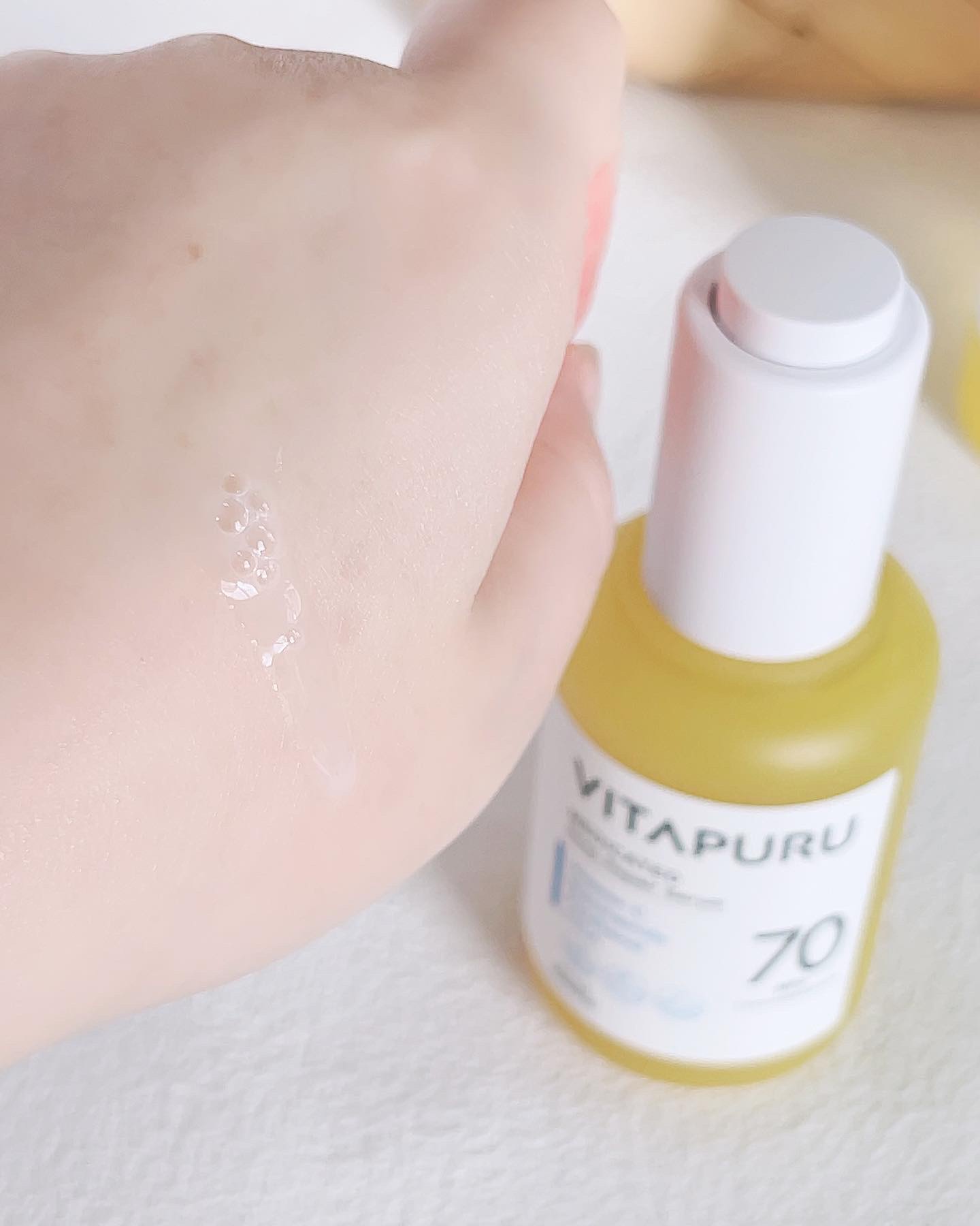 肌に潤いを与え、シミ・そばかすを防いでくもりのない肌へ導く美容液 いちごシロップみたいな見た目が好き、ビタミン12由来の色なんだそう とろみがあるけどメイク前にも使えるのがいいなと思うベタつきにくいテクスチャー