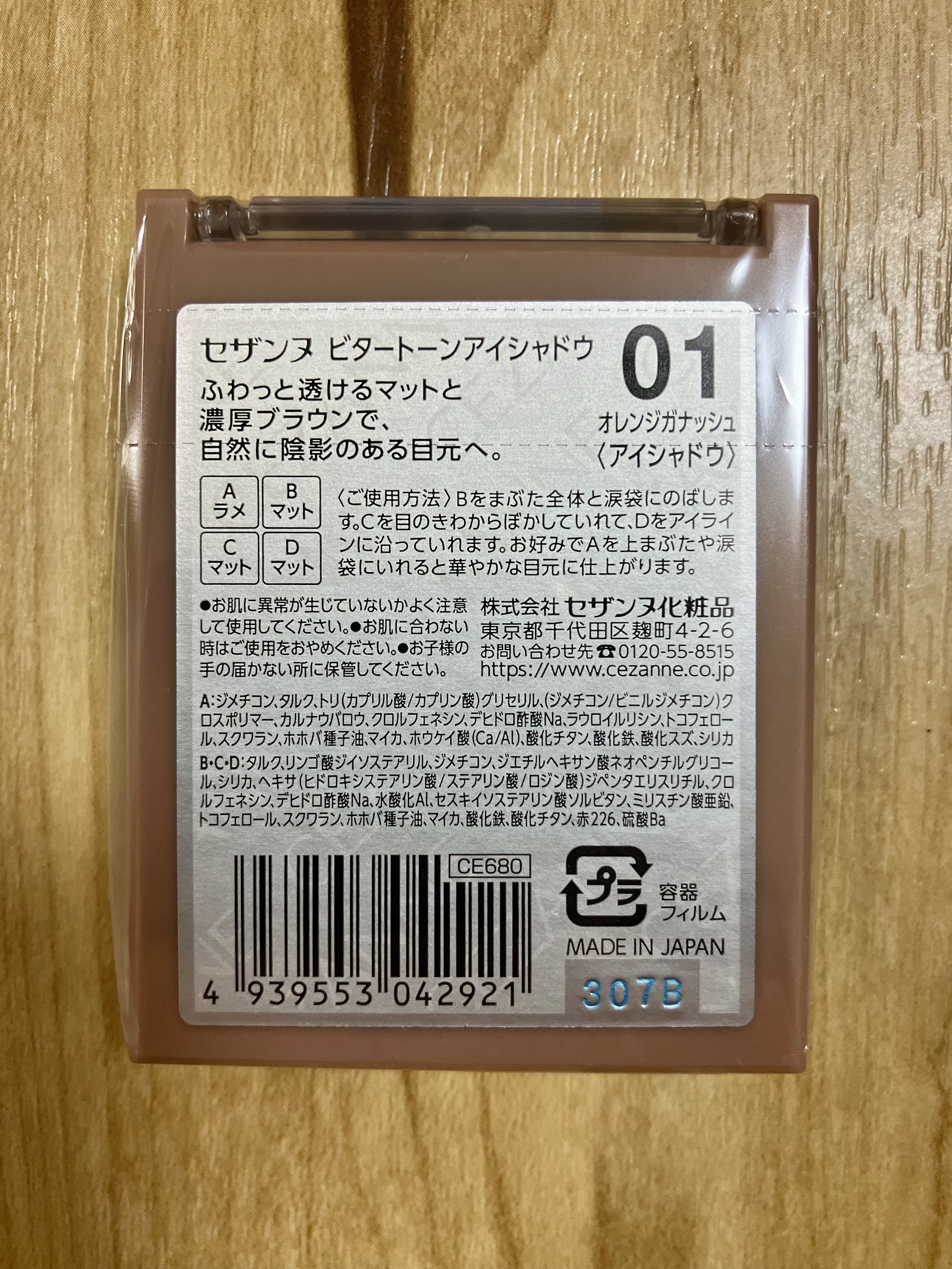- 01 オレンジガナッシュ A:ジメチコン、タルク、トリ(カプリル酸/カプリン酸)グリセリル、(ジメチコン/ビニルジメチコン)クロスポリマー、カルナウバロウ、クロルフェネシン、デヒドロ酢酸Na、ラウロイルリシン、トコフェロール、スクワラン、ホホバ種子油、マイカ、ホウケイ酸(Ca/Al)、酸化チタン、酸化鉄、酸化スズ、シリカ B・C・D:タルク、リンゴ酸ジイソステアリル、ジメチコン、ジエチルヘキサン酸ネオペンチルグリコール、シリカ、ヘキサ(ヒドロキシステアリン酸/ステアリン酸/ロジン酸)ジペンタエリスリチル、クロルフェネシン、デヒドロ酢酸Na、水酸化Al、セスキイソステアリン酸ソルビタン、ミリスチン酸亜鉛、トコフェロール、スクワラン、ホホバ種子油、マイカ、酸化鉄、酸化チタン、赤226、硫酸Ba 02 ドライローズ A:ジメチコン、タルク、トリ(カプリル酸/カプリン酸)グリセリル、(ジメチコン/ビニルジメチコン)クロスポリマー、カルナウバロウ、クロルフェネシン、デヒドロ酢酸Na、ラウロイルリシン、トコフェロール、スクワラン、ホホバ種子油、マイカ、ホウケイ酸(Ca/Al)、酸化チタン、酸化鉄、酸化スズ、グンジョウ B・C・D:タルク、リンゴ酸ジイソステアリル、ジメチコン、ジエチルヘキサン酸ネオペンチルグリコール、シリカ、ヘキサ(ヒドロキシステアリン酸/ステアリン酸/ロジン酸)ジペンタエリスリチル、クロルフェネシン、デヒドロ酢酸Na、水酸化Al、セスキイソステアリン酸ソルビタン、ミリスチン酸亜鉛、トコフェロール、スクワラン、ホホバ種子油、マイカ、酸化鉄、酸化チタン、赤226、硫酸Ba、グンジョウ 03 ビスケットブラウン A:ジメチコン、タルク、トリ(カプリル酸/カプリン酸)グリセリル、(ジメチコン/ビニルジメチコン)クロスポリマー、カルナウバロウ、クロルフェネシン、デヒドロ酢酸Na、ラウロイルリシン、トコフェロール、スクワラン、ホホバ種子油、マイカ、ホウケイ酸(Ca/Al)、酸化チタン、酸化鉄、酸化スズ B・C・D:タルク、リンゴ酸ジイソステアリル、ジメチコン、ジエチルヘキサン酸ネオペンチルグリコール、シリカ、ヘキサ(ヒドロキシステアリン酸/ステアリン酸/ロジン酸)ジペンタエリスリチル、ミリスチン酸亜鉛、クロルフェネシン、デヒドロ酢酸Na、水酸化Al、セスキイソステアリン酸ソルビタン、トコフェロール、スクワラン、ホホバ種子油、マイカ、酸化鉄、酸化チタン、硫酸Ba
