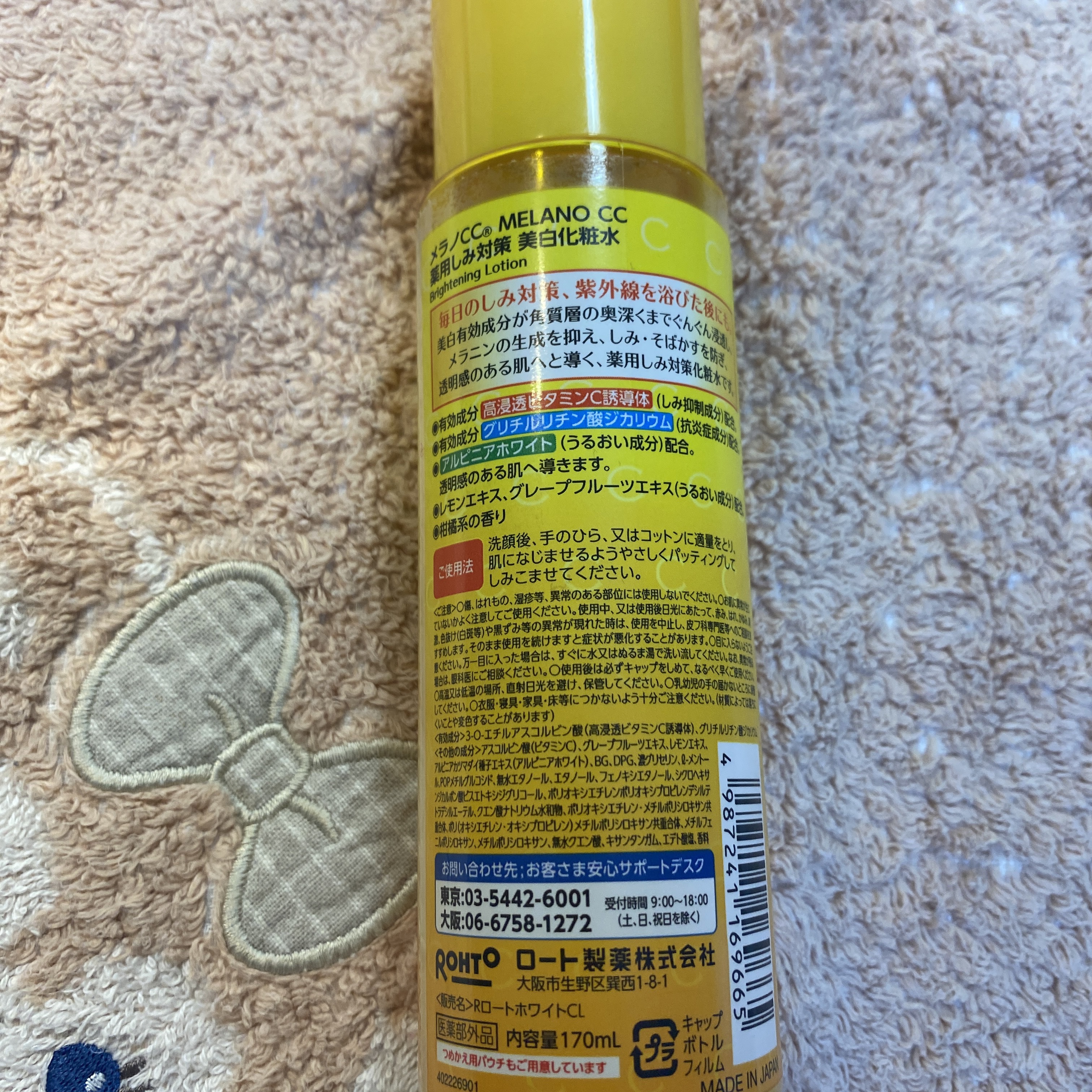 - 「メラノCC 薬用しみ対策 美白化粧水」は、顔全体にうるおいを与えながら、しみ対策できる薬用美白化粧水。 美白有効成分高浸透ビタミンC誘導体*1が角質層すみずみまで浸透し、メラニンの生成を抑え、しみ・そばかすを防ぎ、透明感のある肌へと導きます。 また、抗炎症成分*2と3種のうるおい成分*3を配合。ニキビ痕が気になる肌にもうるおいを与え、肌を整えます。 さわやかな柑橘系の香りです。 *1:3-O-エチルアスコルビン酸 *2:グリチルリチン酸ジカリウム *3:アルピニアホワイト、レモンエキス、グレープフルーツエキス