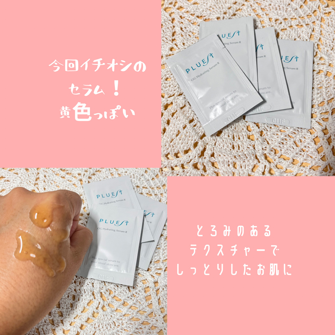 化粧水は甘めの香りで、少しとろみがあり肌に馴染ませやすいです。 美容液もとろみがあり、伸びが良く、少量でも顔全体にしっかり塗ることができます。 クリームは柔らかいテクスチャで、しっかり保湿し、モチッとした肌になりました。
