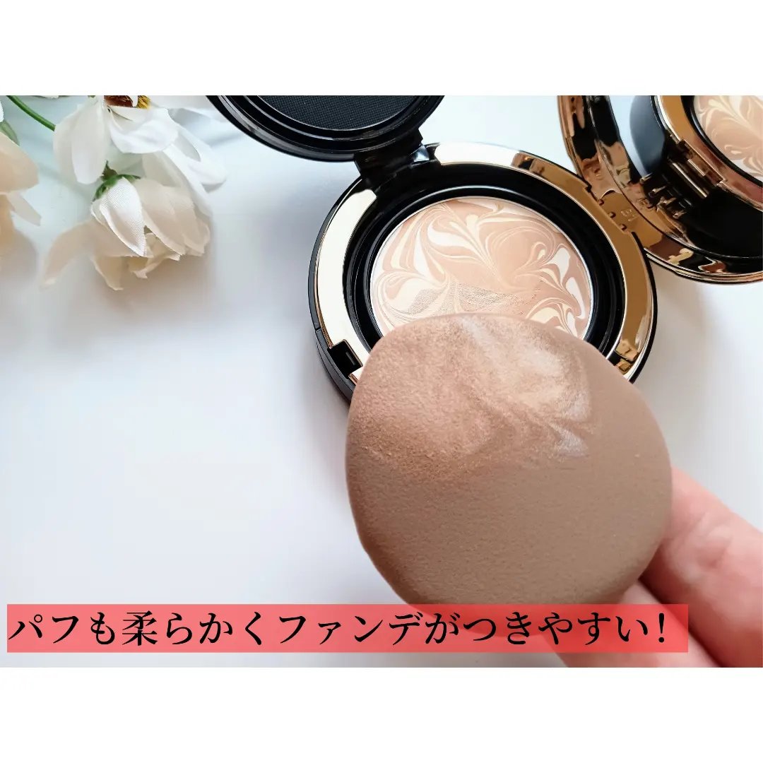 こちらはUVケアも◎ セッティングも簡単に装着できます😁 このブラック色したシンプルデザインの容器も素敵ですよね♡ パフにトントン馴染ませて肌にのせて みると少ししか取っていないのに、つきがよいですね。みずみずしいテクスチャです。 トントンなじませて伸ばしていくと 厚塗り感を感じさせない使用感です。 パフには、ほんの少しつけて内側から外にかけてポンポンと伸ばしていくのが ポイント。 つい、クッションファンデはたっぷりに なっちゃうけどほんの少しで良い◎ そうするとむらなく均一に肌にのせる ことができるね🥺