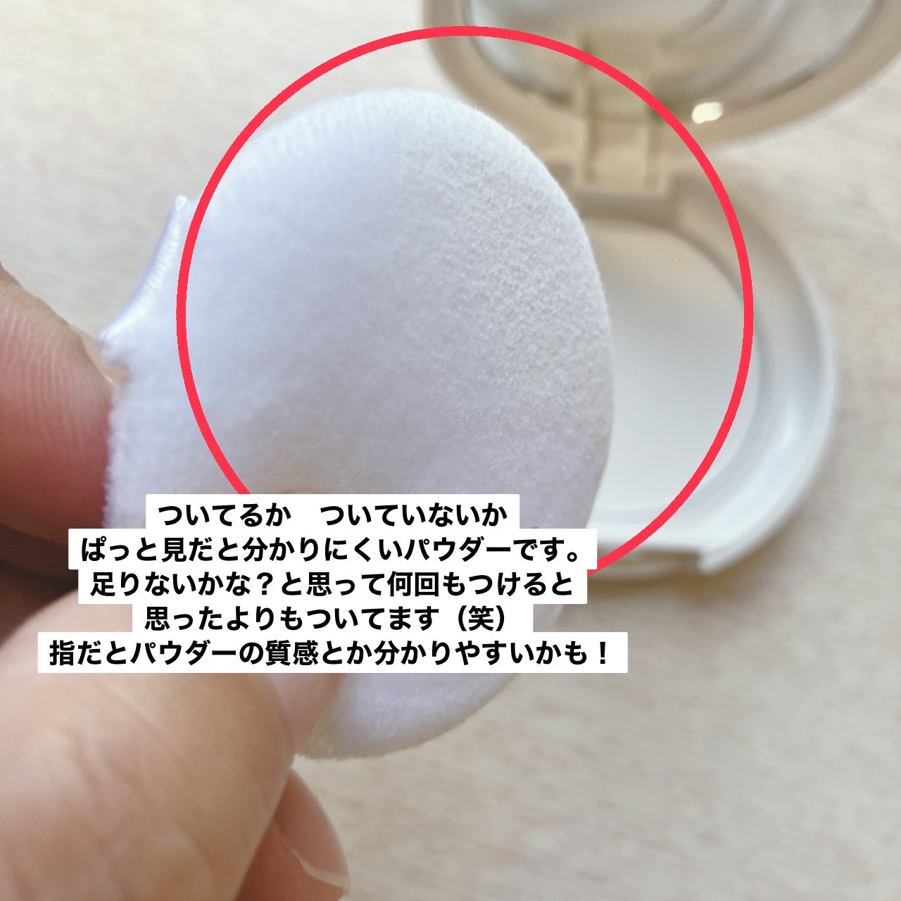 淡いピンク色の可愛いパッケージを開けると、ふわふわのふんわりパフ。 蓋にもパフにも毛穴パテ職人の絵が入っているのも可愛いですね。 かなり少量ずつ、パフに取り出すことができるので厚塗り防止にもなりました。 かなりサラッとした使い心地でパサパサ粉が落ちることもありません。 パフも柔らかいので、最初はちゃんとパウダーが肌に乗っているのか、チェックしたくらいです🤣 少量から使えるので白浮きも気にならず、くすみの気になるところに2度塗りをするような使い方ができるので、好みの厚みにしやすいですね🤔 ベタつきやカサカサも気にならず、手軽に使えるところも気に入っています🎵