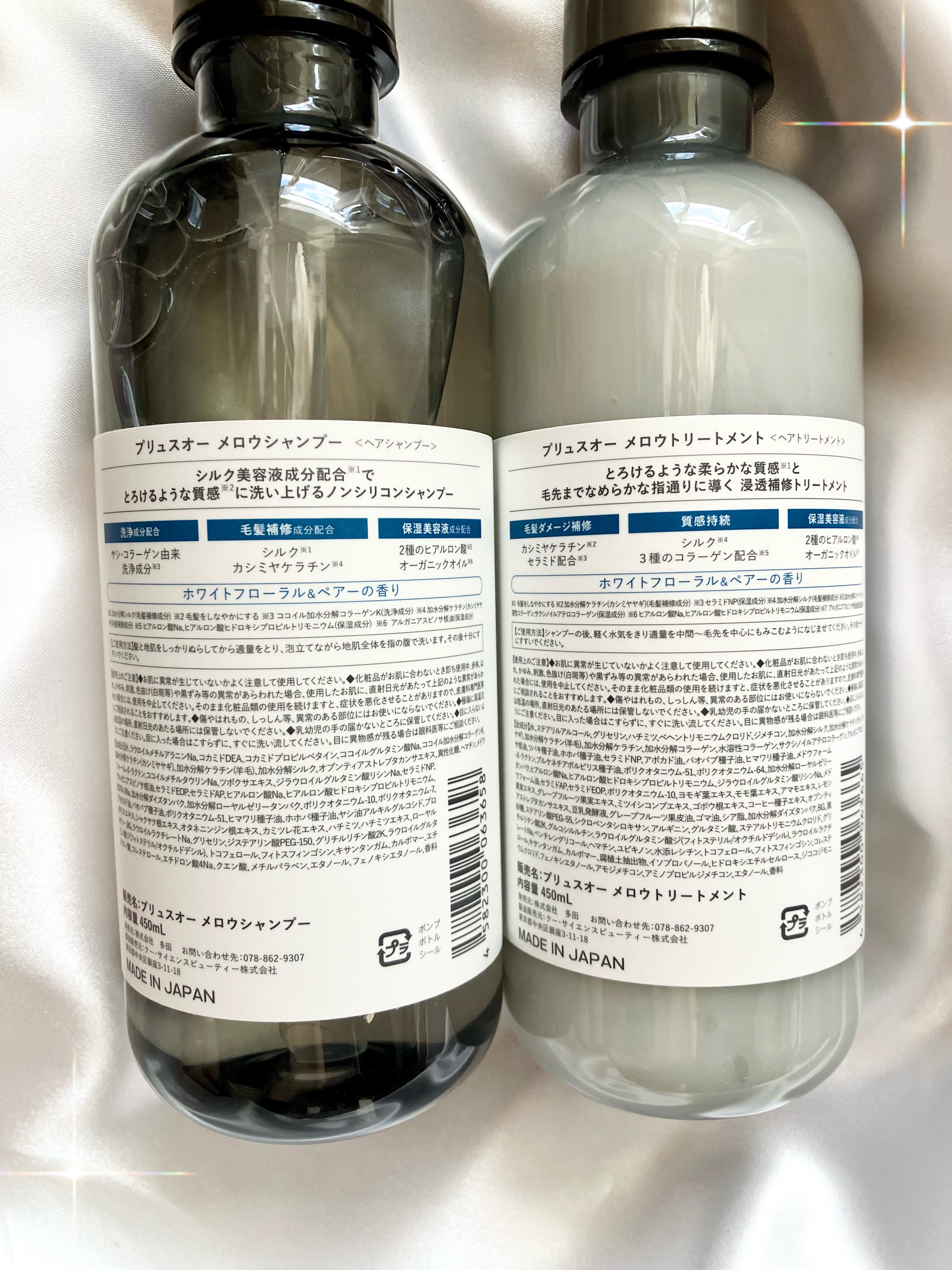 - <シャンプー 450ml> 水、ラウロイルメチルアラニンNa、コカミドDEA、コカミドプロピルベタイン、ココイルグルタミン酸Na、ココイル加水分解コラーゲンK、加水分解ケラチン(カシミヤヤギ)、加水分解ケラチン(羊毛)、加水分解シルク、オプンティアストレプタカンサエキス、異性化糖、ヘマチン、メドウフォーム-δ-ラクトン、ココイルメチルタウリンNa、ツボクサエキス、ジラウロイルグルタミン酸リシンNa、セラミドNP、アルガニアスピノサ核油、セラミドEOP、セラミドAP、ヒアルロン酸Na、ヒアルロン酸ヒドロキシプロピルトリモニウム、EDTA-2Na、加水分解ダイズタンパク、加水分解ローヤルゼリータンパク、ポリクオタニウム-10、ポリクオタニウム-7、アボカド油、バオバブ種子油、ポリクオタニウム-51、ヒマワリ種子油、ホホバ種子油、ヤシ油アルキルグルコシド、プロポリスエキス、シャクヤク根エキス、オタネニンジン根エキス、カミツレ花エキス、ハチミツ、ハチミツエキス、ローヤルゼリー、BG、ラウロイルラクチレートNa、グリセリン、ジステアリン酸PEG-150、グリチルリチン酸2K、ラウロイルグルタミン酸ジ(フィトステリル/オクチルドデシル)、トコフェロール、フィトスフィンゴシン、キサンタンガム、カルボマー、エチドロン酸、コレステロール、エチドロン酸4Na、クエン酸、メチルパラベン、エタノール、フェノキシエタノール、香料 <トリートメント 450ml> 水、ステアリルアルコール、グリセリン、ハチミツ、ベヘントリモニウムクロリド、ジメチコン、加水分解ケラチン(カシミヤヤギ)、加水分解シルク、加水分解コラーゲン、水溶性コラーゲン、サクシノイルアテロコラーゲン、加水分解ケラチン(羊毛)、加水分解ケラチン、アルガニアスピノサ核油、ツバキ種子油、ホホバ種子油、セラミドNP、アボカド油、バオバブ種子油、ヒマワリ種子油、メドウフォーム-δ-ラクトン、プルケネチアボルビリス種子油、ポリクオタニウム-51、ポリクオタニウム-64、加水分解ローヤルゼリータンパク、ヒアルロン酸Na、ヒアルロン酸ヒドロキシプロピルトリモニウム、ジラウロイルグルタミン酸リシンNa、メドウフォーム油、セラミドAP、セラミドEOP、ポリクオタニウム-10、ヨモギ葉エキス、モモ葉エキス、アマモエキス、レモン果実エキス、グレープフルーツ果実エキス、ミツイシコンプエキス、ゴボウ根エキス、コーヒー種子エキス、アプンティアストレプタカンサエキス、豆乳発酵液、グレープフルーツ果皮油、ゴマ油、シア脂、加水分解ダイズタンパク、BG、黒砂糖、ステアリン酸PEG-55、シクロベンタシロキサン、アルギニン、グルタミン酸、ステアルトリモニウムクロリド、グリチルリチン酸2K、グルコシルルチン、ラウロイウグルタミン酸ジ(フィトステリル/オクチルドデシル)、ラウロイルラクチレートNa、ベンチレングリコール、ヘマチン、ユビキノン、水添レシチン、トコフェロール、フィトスフィンゴシン、コレステロール、キサンタンガム、カルポマー、腐植土抽出物、イソプロパノール、ヒドロキシエチルセルロース、ジココジモニウムクロリド、フェノキシエタノール、アモジメチコン、アミノプロピルジメチコン、エタノール、香料 <シャンプー詰替用 350ml> 水、ラウロイルメチルアラニンNa、コカミドDEA、コカミドプロピルベタイン、ココイルグルタミン酸Na、加水分解ケラチン(カシミヤヤギ)、加水分解ケラチン(羊毛)、加水分解シルク、ココイル加水分解コラーゲンK、オプンティアストレプタカンサエキス、異性化糖、ヘマチン、メドウフォーム-δ-ラクトン、ココイルメチルタウリンNa、ツボクサエキス、ジラウロイルグルタミン酸リシンNa、セラミドNP、アルガニアスピノサ核油、セラミドEOP、セラミドAP、ヒアルロン酸Na、ヒアルロン酸ヒドロキシプロピルトリモニウム、EDTA-2Na、加水分解ダイズタンパク、加水分解ローヤルゼリータンパク、ポリクオタニウム-10、ポリクオタニウム-7、アボカド油、バオバブ種子油、ポリクオタニウム-51、ヒマワリ種子油、ホホバ種子油、ヤシ油アルキルグルコシド、プロポリスエキス、シャクヤク根エキス、オタネニンジン根エキス、カミツレ花エキス、ハチミツ、ハチミツエキス、ローヤルゼリー、BG、ラウロイウラクチレートNa、グリセリン、ジステアリン酸PEG-150、グリチルリチン酸2K、ラウロイルグルタミン酸ジ(フィトステリル/オクチルドデシル)、トコフェロール、フィトスフィンゴシン、キサンタンガム、カルポマー、エチドロン酸、コレステロール、エチドロン酸4Na、クエン酸、メチルパラベン、エタノール、フェノキシエタノール、香料 <トリートメント詰替用 350ml> 水、ステアリルアルコール、グリセリン、ハチミツ、ベヘントリモニウムクロリド、ジメチコン、加水分解シルク、加水分解ケラチン(カシミヤヤギ)、加水分解ケラチン(羊毛)、加水分解ケラチン、加水分解コラーゲン、水溶性コラーゲン、サクシノイルアテロコラーゲン、アルガニアスピノ