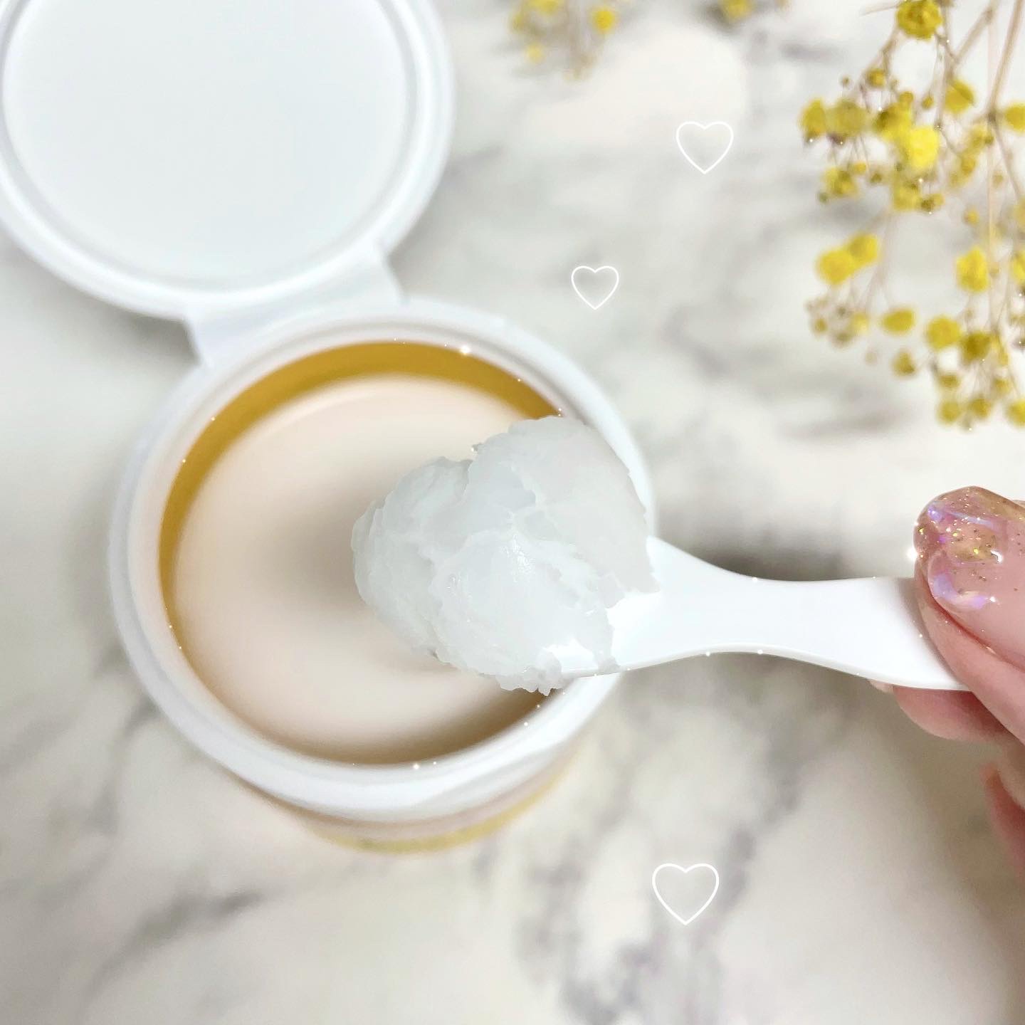 \かわいすぎて事件🤯💘⚡️濡れツヤハイライト/ 上品でキラキラのツヤが美しすぎると発売前から話題でしたね🙌 エナメル+キルティング加工のケースはツルツルぷにぷに♬ 薄型なので持ち運びにも便利!かわいいので無駄に持ち歩こう🙋♀️(?) 細かなピンクパールが温かみのあるツヤを演出してくれます💗 とてもしっとりしたパウダーで粉感がなく、繊細な輝きが長続きします👏 大粒の偏光ラメがギラギラ🤩🥳祭りじゃ〜!といった感じ笑 ホワイトカラーで輝きが目立つので濡れたようなツヤ感が出ます✨ マスクメイクでも頬骨より少し上のCゾーンに入れれば隠れずツヤ感が綺麗に映えます🥰 ラメが大粒で強いのでアイメイクの仕上げに入れても💮 結果万能なのとちょっと奇抜なの♥️ 両方文句なしにかわいかったので満足です🧚♀️笑