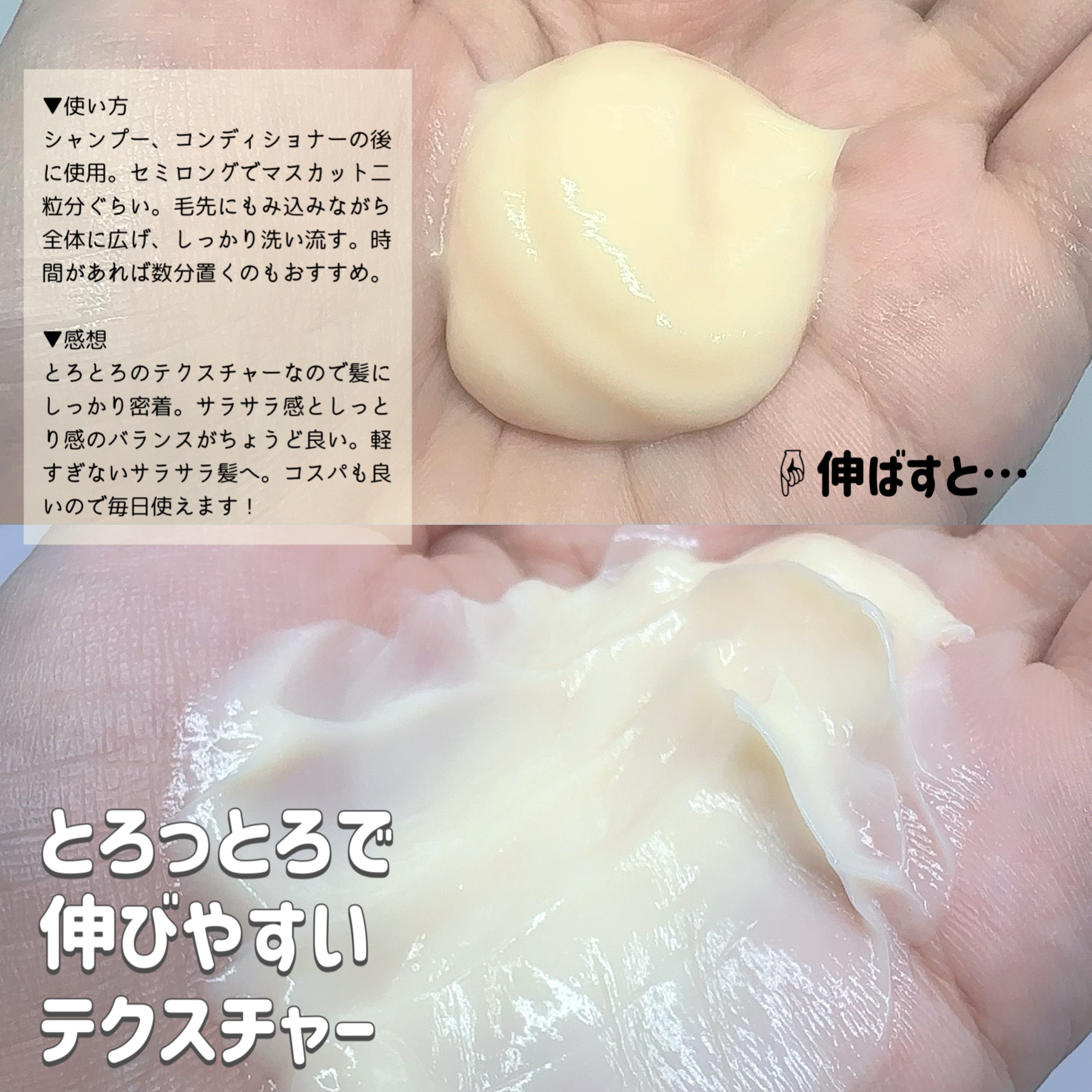 | 濃厚なテクスチャーで、髪1本1本に行き届くような感じがしました😆🎶 | 詳細を見る | ||
