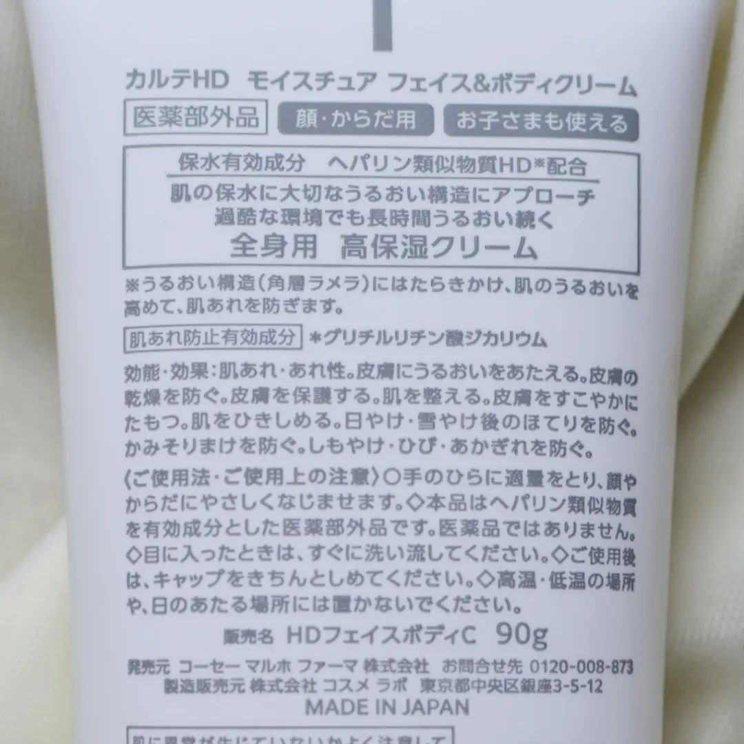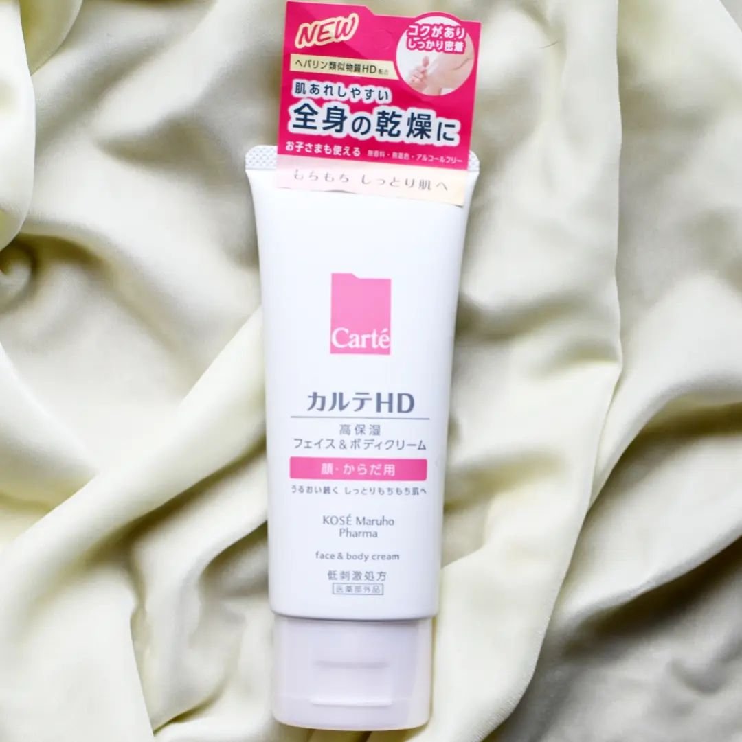 - 【全身用高保湿クリーム】 コーセーとマルホの合弁会社コーセーマルホファーマから発売された「カルテHD」。マルホから唯一供給を受けた「ヘパリン類似物質HD」を配合。 ゴワついたあれがちな肌にもピタッと密着、もっちりなめらか肌に導く全身用高保湿クリーム。 ひじ・ひざ・かかとなど気になるパーツにもピタッと密着してシールドできる「ワセリン」や「ピタッと保護膜オイル」を高配合。 それでいてのびの良いオイルとバランスよく組み合わせているから、腕やすねなどの広い範囲にもスーッと軽やかにのばせます。 フェイス&ボディローションと共通の「肌やわらかオイル」も配合。 濃厚なうるおいで肌をしっかり包み込みながらべたつかない使い心地です。