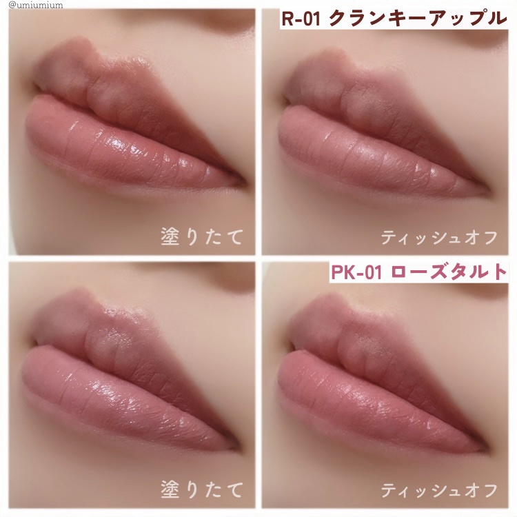 スルっと塗れる柔らかめな質感 乾燥しにくいですが、何度も塗り直す場合は保湿した方がいいと思います…! ソフトマットな仕上がりで、マットリップ苦手でも使いやすそうです◎ R-01は柔らかいレッドブラウン カラバリはくすんだ色が多く、おしゃれな色ばかりなのでおすすめです☻