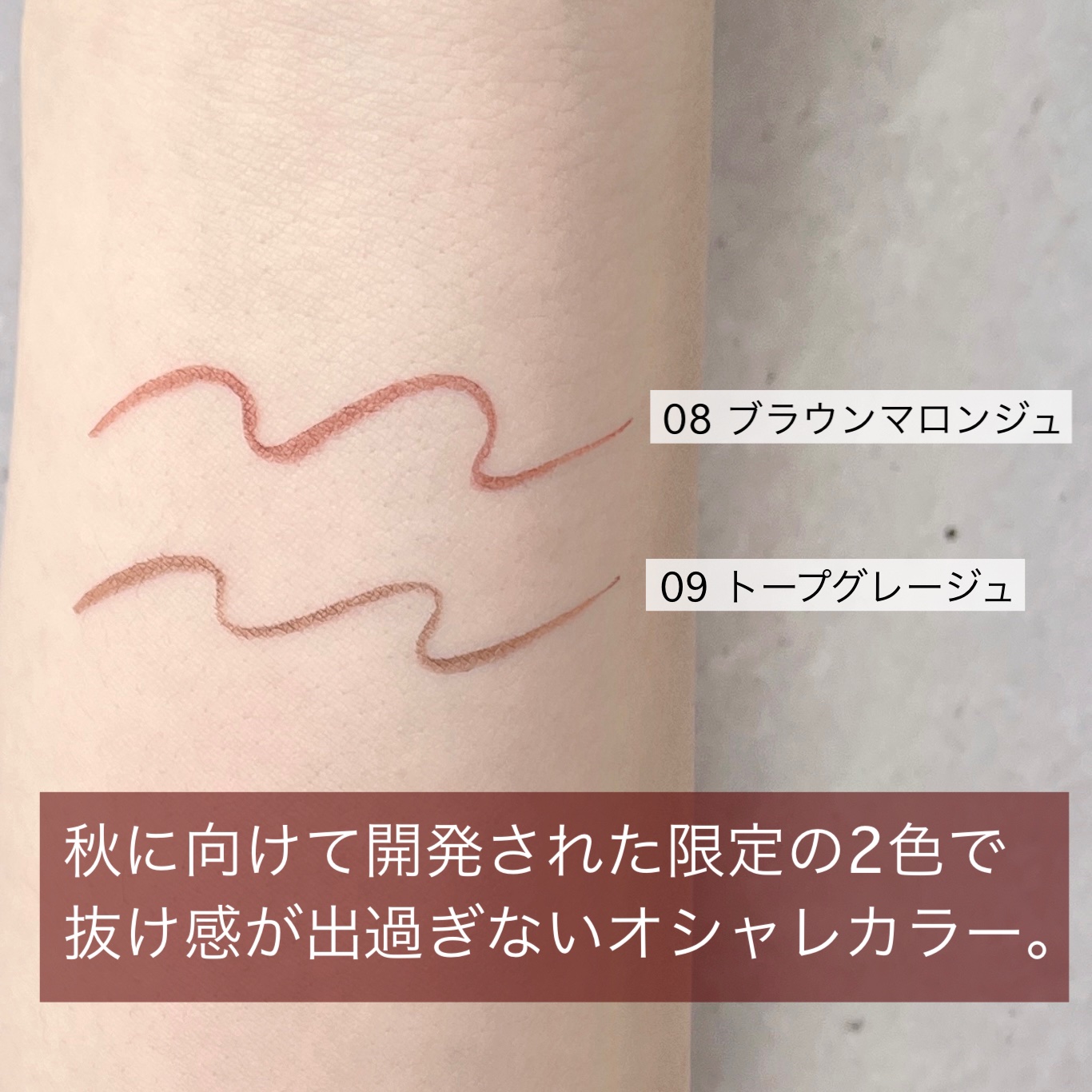 - <01 ブラック> 水、(アクリル酸エチルヘキシル/メタクリル酸メチル)コポリマー、BG、エタノール、(アクリレーツ/メチルスチレン/スチレン)コポリマーアンモニウム、カニナバラ果実エキス、サクシノイルアテロコラーゲン、パンテノール、ヒアルロン酸Na、(アクリレーツ/オクチルアクリルアミド)コポリマー、AMP、EDTA-2Na、TEA、ベヘネス-30、リン酸2Na、リン酸K、フェノキシエタノール、プロピルパラベン、メチルパラベン、安息香酸Na、安息香酸、カーボンブラック <02 ビターチョコブラウン> 水、(アクリル酸エチルヘキシル/メタクリル酸メチル)コポリマー、BG、(アクリレーツ/メチルスチレン/スチレン)コポリマーアンモニウム、カニナバラ果実エキス、サクシノイルアテロコラーゲン、パンテノール、ヒアルロン酸Na、(アクリレーツ/オクチルアクリルアミド)コポリマー、AMP、EDTA-2Na、TEA、エタノール、ベヘネス-30、ポリアスパラギン酸Na、リン酸2Na、リン酸K、フェノキシエタノール、プロピルパラベン、メチルパラベン、安息香酸Na、安息香酸、カーボンブラック、酸化鉄 <05 グレージュ> 水、(アクリル酸エチルヘキシル/メタクリル酸メチル)コポリマー、BG、炭、1,2-ヘキサンジオール、パンテノール、ヒアルロン酸Na、カニナバラ果実エキス、サクシノイルアテロコラーゲン、べへネス-25、ペンチレングリコール、エチルヘキシルグリセリン、カプリリルグリコール、ポリアスパラギン酸Na、EDTA-2Na、水酸化Al、グリセリン、ジラウロイルグルタミン酸リシンNa、べへネス-30、(アクリレーツ/メチルスチレン/スチレン)コポリマーアンモニウム、リン酸2Na、リン酸K、メチルパラベン、フェノキシエタノール、酸化チタン、酸化鉄 <10 セピアグレージュ> 水、(スチレン/アクリレーツ)コポリマーアンモニウム、BG、炭、1,2-ヘキサンジオール、パンテノール、ヒアルロン酸Na、カニナバラ果実エキス、サクシノイルアテロコラーゲン、水酸化Al、べへネス-25、べへネス-30、カプリリルグリコール、EDTA-2Na、エチルヘキシルグリセリン、グリセリン、ペンチレングリコール、ジラウロイルグルタミン酸リシンNa、ポリアスパラギン酸Na、リン酸K、リン酸2Na、フェノキシエタノール、メチルパラベン、酸化鉄、酸化チタン <06 ローズグレージュ> 水、アクリレーツコポリマー、BG、炭、1,2-ヘキサンジオール、パンテノール、ヒアルロン酸Na、カニナバラ果実エキス、サクシノイルアテロコラーゲン、べへネス-25、ペンチレングリコール、エチルヘキシルグリセリン、カプリリルグリコール、ポリアスパラギン酸Na、EDTA-2Na、水酸化Al、グリセリン、ジラウロイルグルタミン酸リシンNa、水酸化K、DPG、リン酸2Na、リン酸K、メチルパラベン、フェノキシエタノール、酸化チタン、赤226、酸化鉄