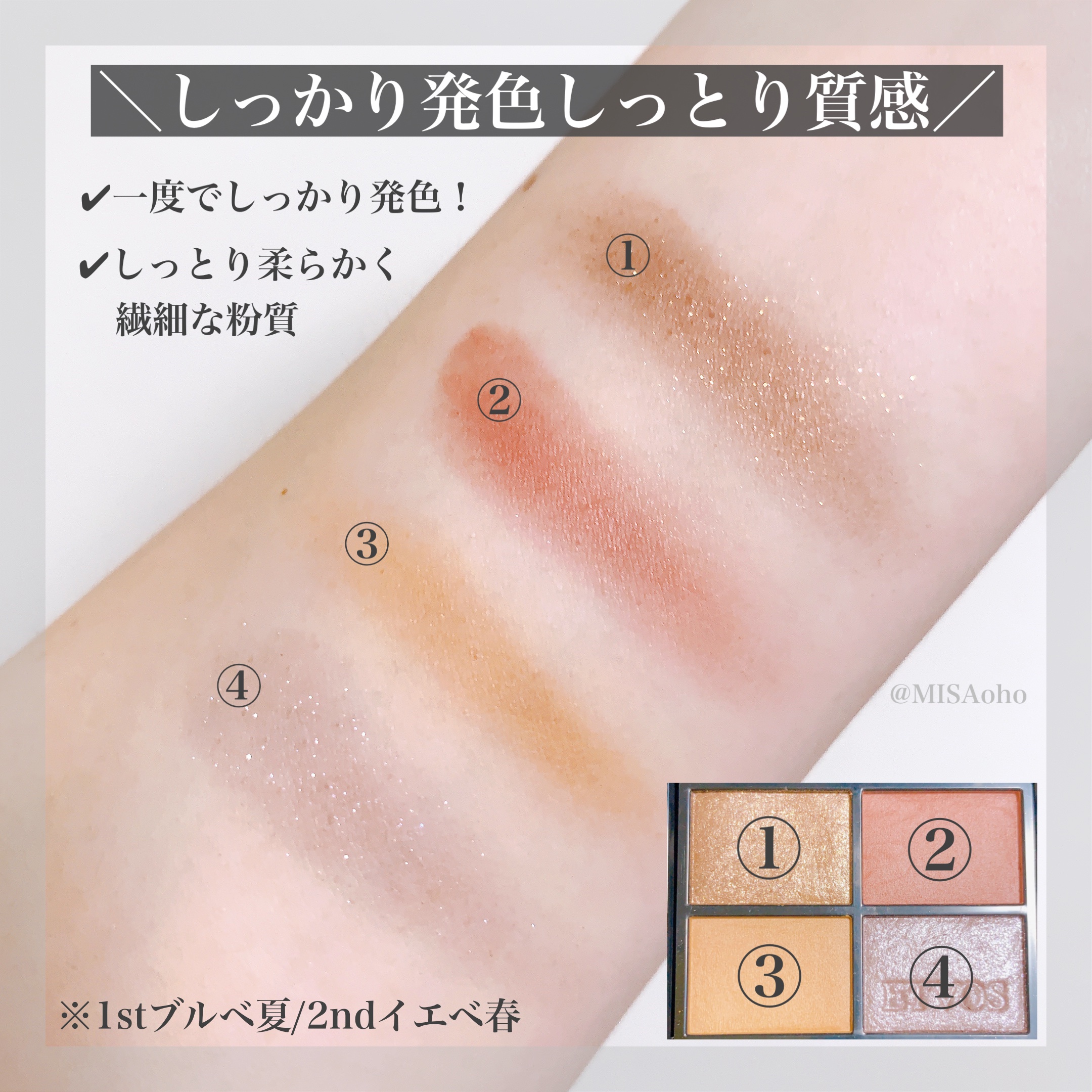 - 敏感肌のまぶたをケアしながら、美しく彩る。ミネラルの色と光を重ねて、メイクするたび自分らしく。 着眼点は「大人のくすみ※1やすい、まぶた」。 敏感になってしまった肌に対し、8種の美容成分※2がうるおいを与えながら丁寧にケアします。 なりたい表情をメイクで叶えながら、健やかな透明感※3のあるまぶたへ。 大人の目もとを上品なツヤと発色で彩る4色アイカラーは、まぶたに吸い付くような質感で、澄んだ眼差しを演出します。 心のままに色を重ねて、なりたい自分を描いて。 ※1 乾燥によるもの ※2 保湿成分:ヒアルロン酸Na、ポリクオタニウム-61、シロキクラゲ多糖体、アシタバ葉/茎エキス、クダモノトケイソウ果実エキス、モモ花エキス 整肌成分:グリチルレチン酸ステアリル、グリチルリチン酸2K ※3 メイクアップ効果による
