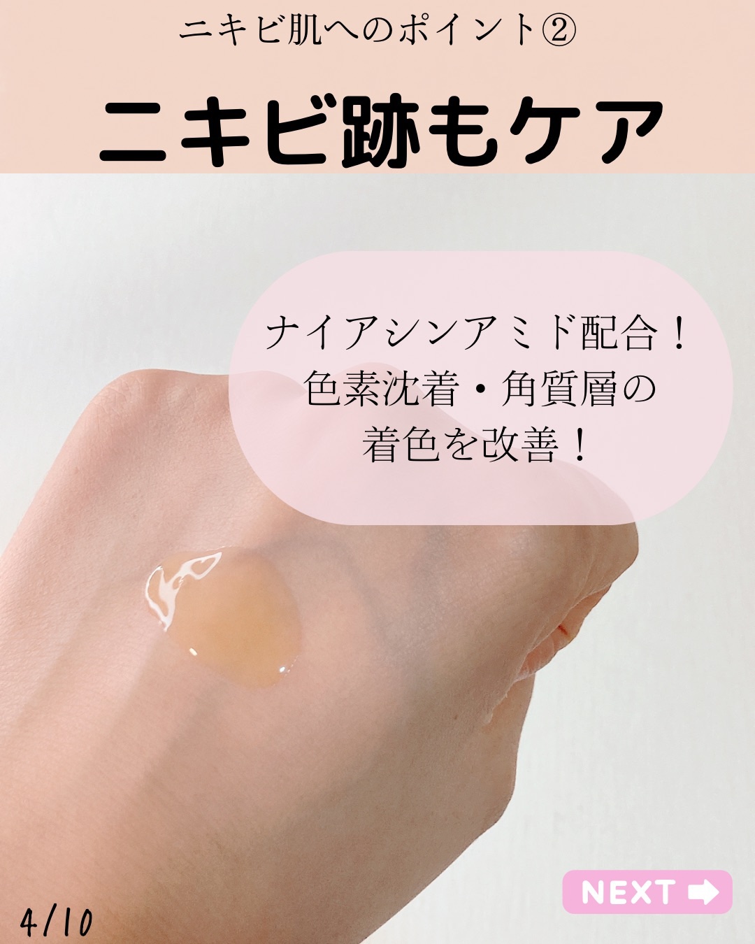 ニキビ菌〜ニキビ跡(シミになりやすいニキビ跡の日焼けによるシミを予防すること。)までの一連の流れをしっかりケア! アクネ菌を99.9%除去してくれるので、悩んでいる方、一度試してみてほしいです👌✨ サクシニック成分(コハク酸、整肌成分)が含まれていることから、毛穴の老廃物や皮脂、角質をケアしてくれ、ニキビをできにくくしてくれます。