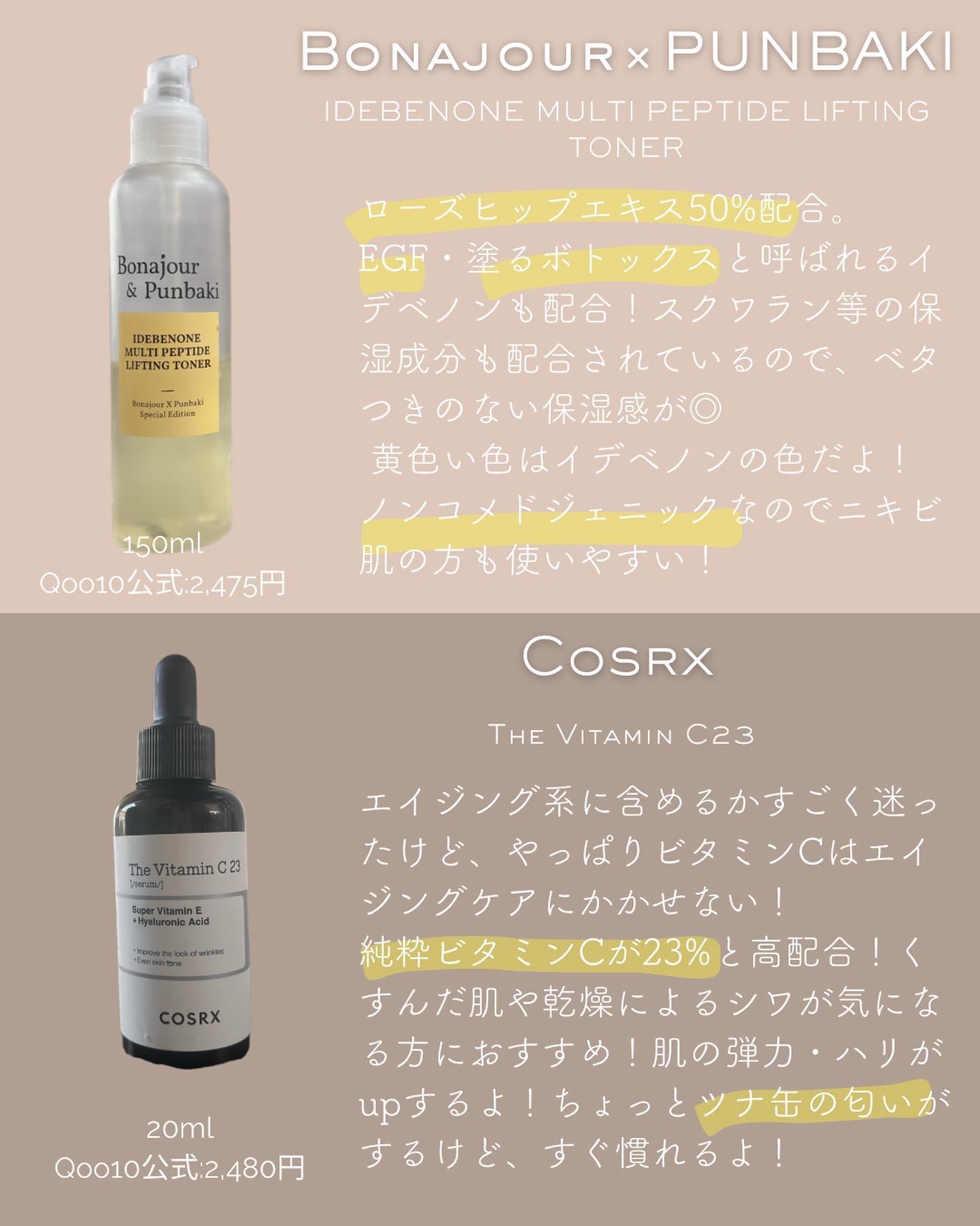ビタミンC系って、ほんと肌によって合う合わないがあるから、高濃度だから良いってわけでもないし、保管方法や使用期限があってめんどくさいやつもある🤔 まだまだ使えてないビタミンC美容液もあるし、これからまた良いのあったら、最新版のまとめを出しまーす🫶 みんなのおすすめのビタミンC美容液、良かったら教えてね♡