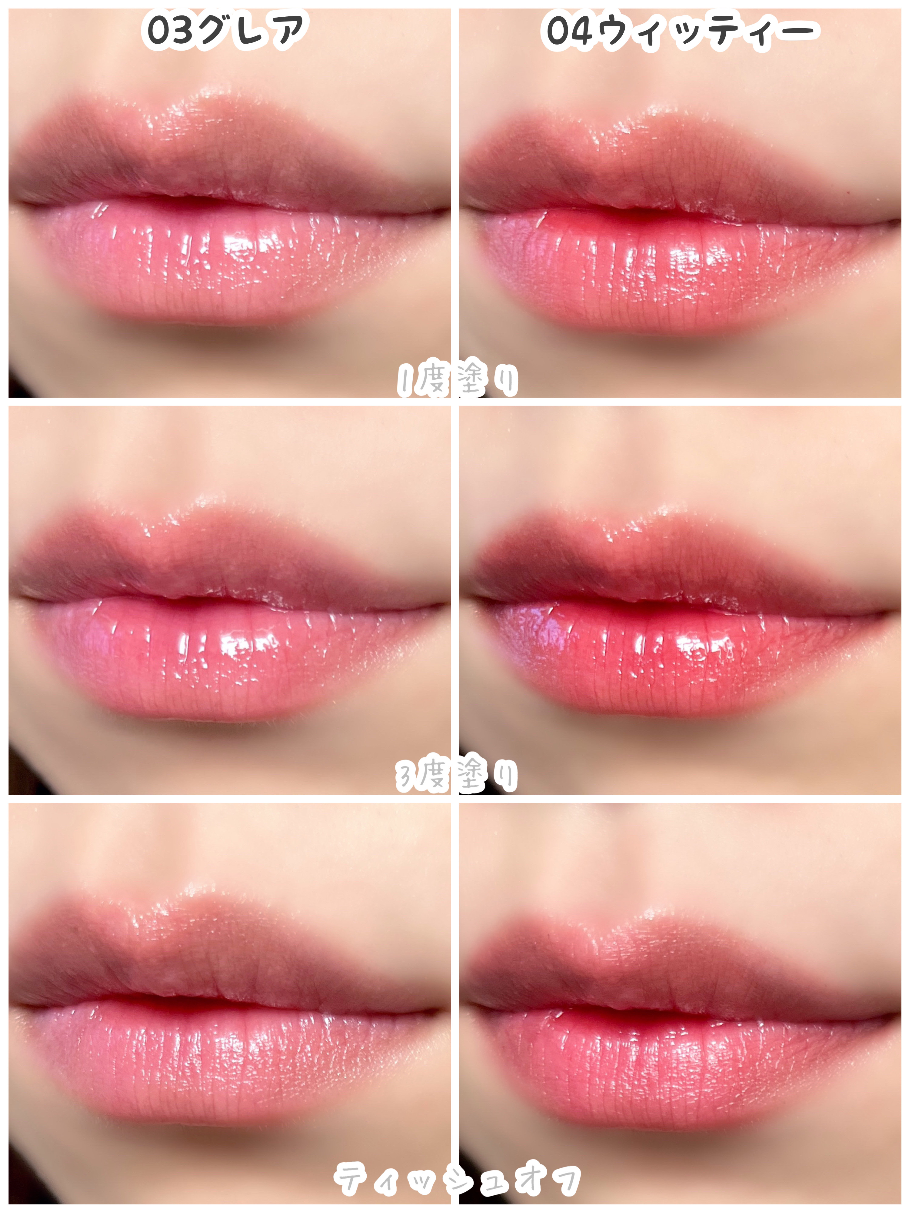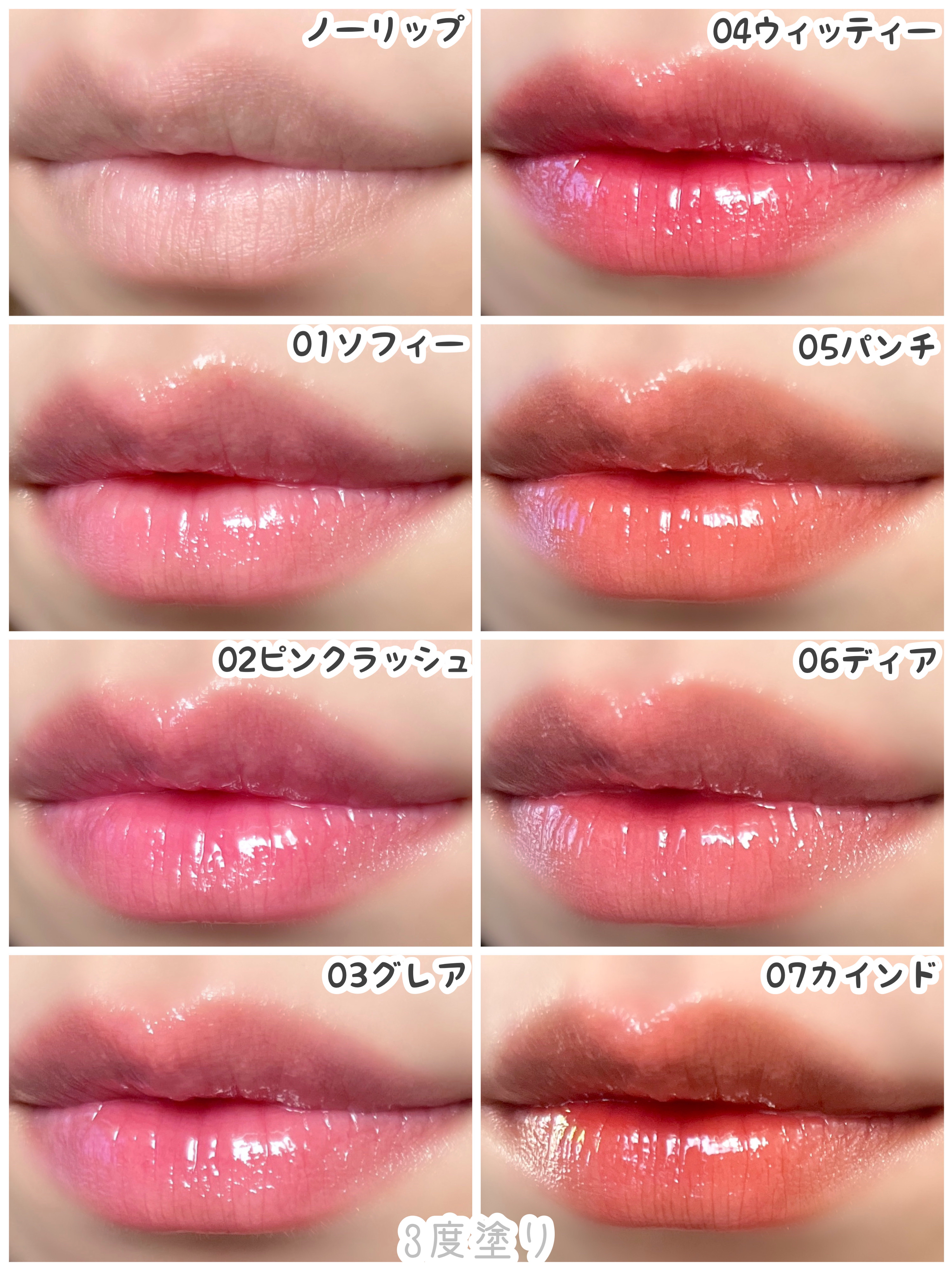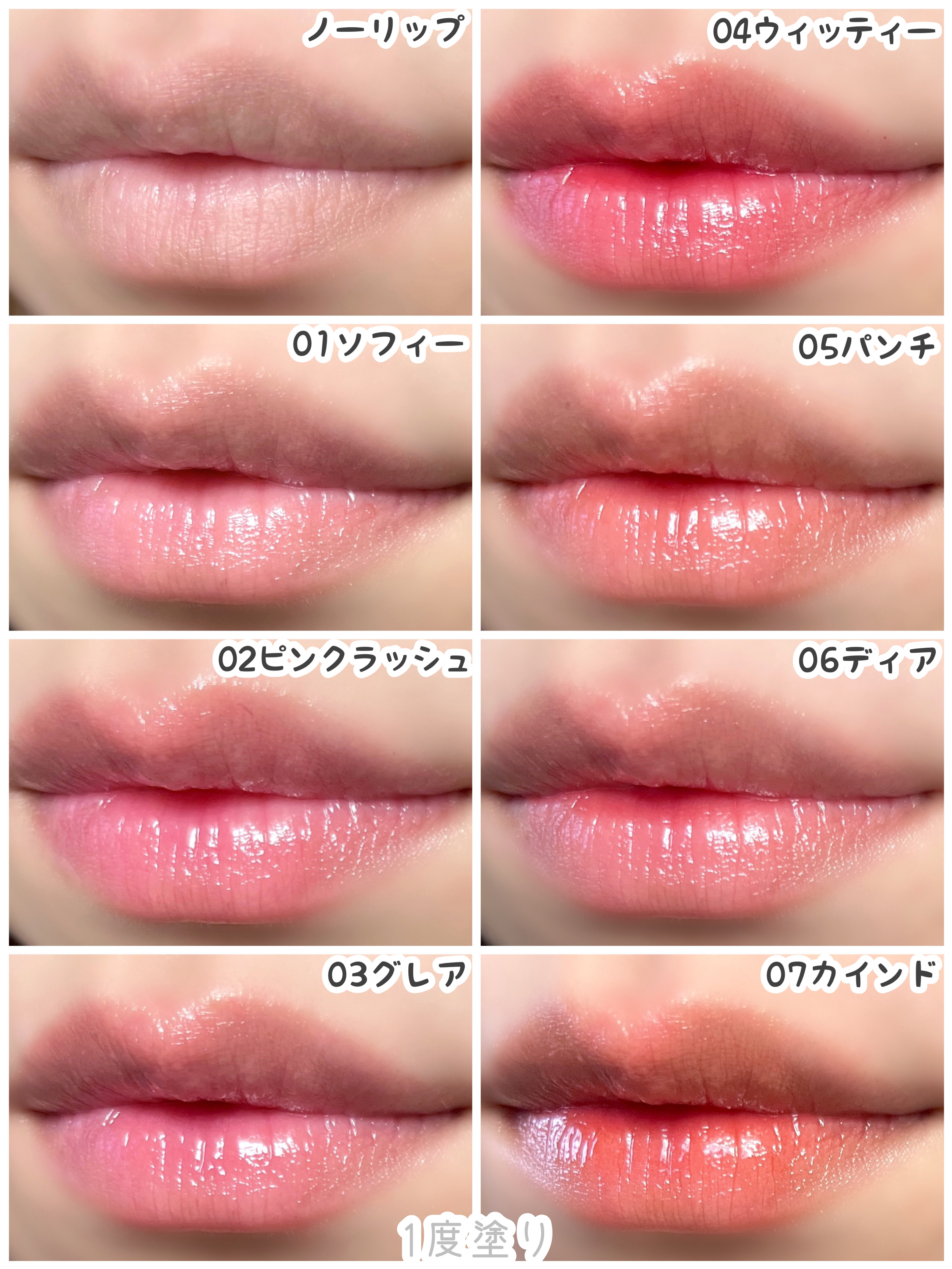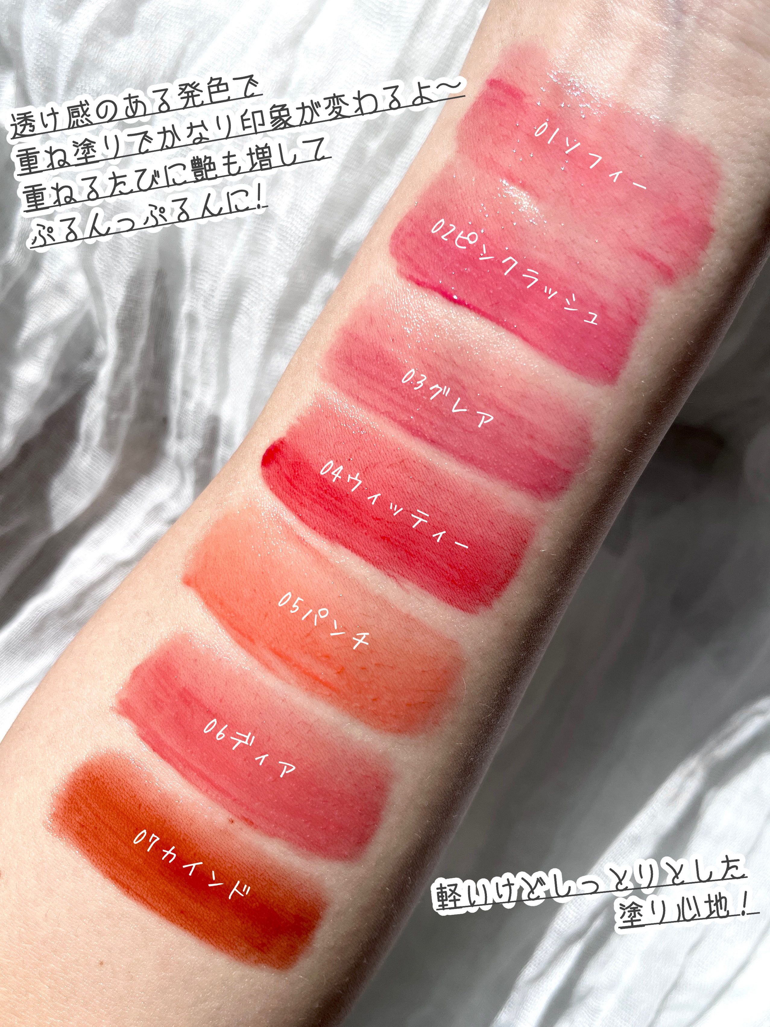 - <01 ソフィー(Surfy)> リンゴ酸ジイソステアリル、ジフェニルシロキシフェニルトリメチコン、精製水、ジフェニルジメチコン、ビスジグリセリルポリアシルアジペート-2、水添ポリイソブテン、ポリグリセリン-3、ポリソルベート60、セチルPEG/PPG-10/1ダイメチコン、イソステアリン酸ソルビタン、BG、ペンチレングリコール、1,2-ヘキサンジオール、ダイメジメチコン、アクリル酸ヒドロキシエチル/ナトリウムアクリロイルジメチルタウリン酸共重合体スクアラン、セテアレス-20、二酸化チタン、エチルヘキシルグリセリン、赤色227号、黄色5 号、香料、赤色104号(1)、水酸化酸化アルミニウム、ポリアクリル酸アンモニウム溶液、黄色4号、フェノキシエタノール、マカデミア種子油、ローズヒップ油、ツバキ油、トコフェロール <02 ピンクラッシュ(Pinkrush)> リンゴ酸ジイソステアリル、ジフェニルシロキシフェニルトリメチコン、精製水、ビスジグリセリルポリアシルアジペート-2、ジフェニルジメチコン、水添ポリイソブテン、ポリグリセリン-3、ポリソルベート60、セチルPEG/PPG-10/1ダイメチコン、イソステアリン酸ソルビタン、BG、ダイメジメチコン、ペンチレングリコール、1,2-ヘキサンジオール、アクリル酸ヒドロキシエチル/ナトリウムアクリロイルジメチルタウリン酸共重合体スクアラン、セテアレス-20、二酸化チタン、エチルヘキシルグリセリン、赤色227号、黄色5 号、香料、水酸化酸化アルミニウム、ポリアクリル酸アンモニウム溶液、フェノキシエタノール、マカデミア種子油、ローズヒップ油、ツバキ油、トコフェロール <03 グレア(Glare) > リンゴ酸ジイソステアリル、ジフェニルシロキシフェニルトリメチコン、精製水、ビスジグリセリルポリアシルアジペート-2、ジフェニルジメチコン、水添ポリイソブテン、ポリグリセリン-3、ポリソルベート60、セチルPEG/PPG-10/1ダイメチコン、イソステアリン酸ソルビタン、BG、ペンチレングリコール、1,2-ヘキサンジオール、ダイメジメチコン、アクリル酸ヒドロキシエチル/ナトリウムアクリロイルジメチルタウリン酸共重合体スクアラン、セテアレス-20、二酸化チタン、エチルヘキシルグリセリン、黄色5 号、香料、赤色104号(1)、赤色227号、水酸化酸化アルミニウム、ポリアクリル酸アンモニウム溶液、黄色4号、フェノキシエタノール、ブリリアントブルーFCF、マカデミア種子油、ローズヒップ油、ツバキ油、トコフェロール <04 ウィッティー(Witty)> リンゴ酸ジイソステアリル、ジフェニルシロキシフェニルトリメチコン、精製水、ビスジグリセリルポリアシルアジペート-2、ジフェニルジメチコン、水添ポリイソブテン、ポリグリセリン-3、ポリソルベート60、セチルPEG/PPG-10/1ダイメチコン、イソステアリン酸ソルビタン、BG、ダイメジメチコン、ペンチレングリコール、1,2-ヘキサンジオール、アクリル酸ヒドロキシエチル/ナトリウムアクリロイルジメチルタウリン酸共重合体スクアラン、セテアレス-20、二酸化チタン、黄色5 号、赤色227号、エチルヘキシルグリセリン、香料、水酸化酸化アルミニウム、ポリアクリル酸アンモニウム溶液、フェノキシエタノール、マカデミア種子油、ローズヒップ油、ツバキ油、トコフェロール <05 パンチ(Punch)> リンゴ酸ジイソステアリル、ジフェニルシロキシフェニルトリメチコン、精製水、ジフェニルジメチコン、ビスジグリセリルポリアシルアジペート-2、水添ポリイソブテン、ポリグリセリン-3、ポリソルベート60、セチルPEG/PPG-10/1ダイメチコン、イソステアリン酸ソルビタン、BG、ペンチレングリコール、1,2-ヘキサンジオール、ダイメジメチコン、アクリル酸ヒドロキシエチル/ナトリウムアクリロイルジメチルタウリン酸共重合体二酸化チタン、スクアラン、セテアレス-20、黄色5 号、エチルヘキシルグリセリン、香料、赤色227号、赤色104号(1)、水酸化酸化アルミニウム、ポリアクリル酸アンモニウム溶液、フェノキシエタノール、マカデミア種子油、ローズヒップ油、ツバキ油、トコフェロール <06 ディア(Dear)> リンゴ酸ジイソステアリル、ジフェニルシロキシフェニルトリメチコン、精製水、ジフェニルジメチコン、ビスジグリセリルポリアシルアジペート-2、水添ポリイソブテン、ポリグリセリン-3、ポリソルベート60、セチルPEG/PPG-10/1ダイメチコン、イソステアリン酸ソルビタン、BG、ペンチレングリコール、1,2-ヘキサンジオール、ダイメジメチコン、アクリル酸ヒドロキシエチル/ナトリウムアクリロイルジメチルタウリン酸共重合体スクアラン、セテアレス-20、二酸化チタン、エチルヘキシルグリセリン、黄色5 号、赤色227号、香料、水酸化酸化アルミニウム、黄色4号、ポリアクリル酸アンモニウム溶液、フェノキシエタノール、マカデミア種子油、ブリリアントブルーFCF、ローズヒップ油、ツバキ油、トコフェロール <07 カインド(Kind)> リンゴ酸ジイソステアリル、ジフェニルシロキシフェニルトリメチコン、精製水、ジフェニルジメチコン