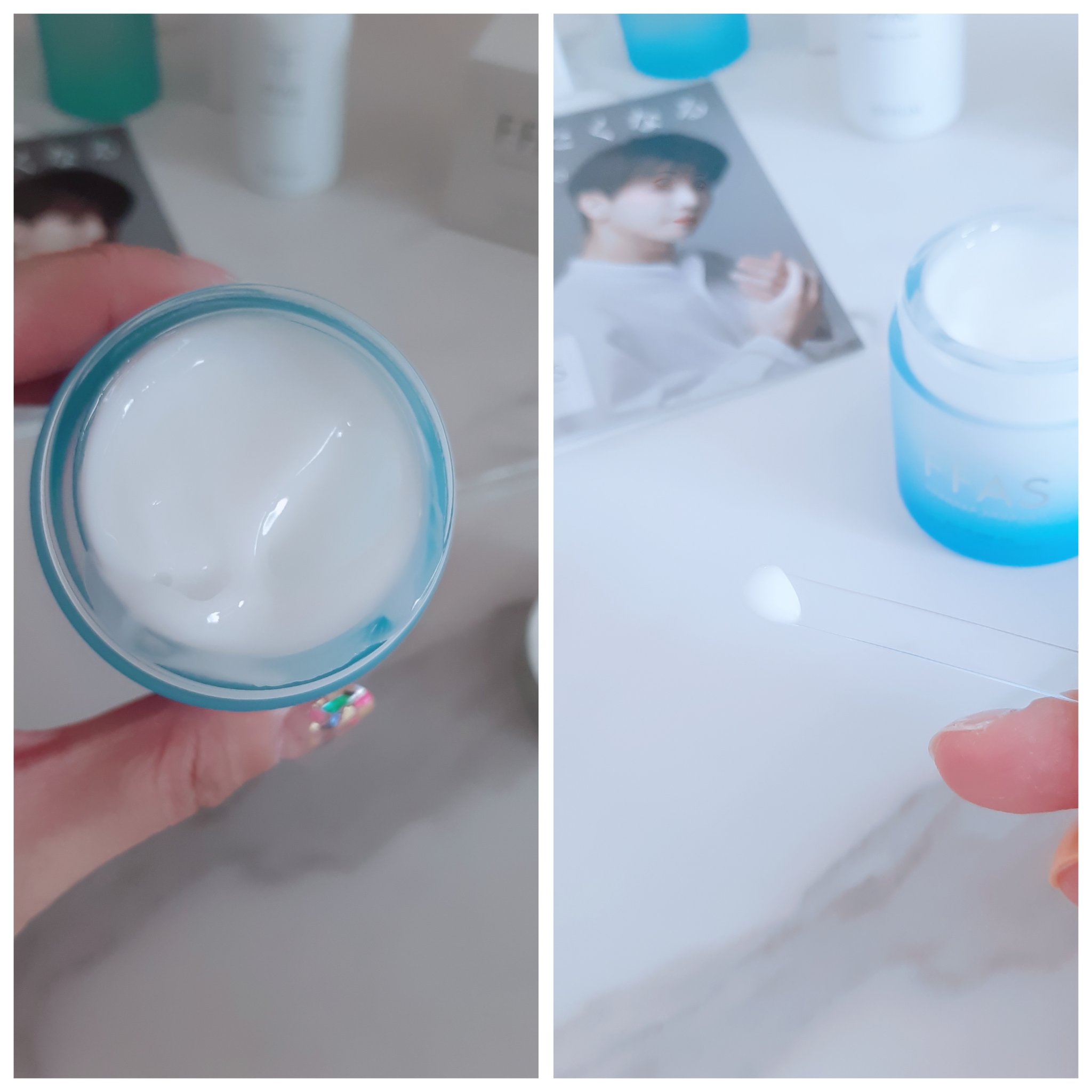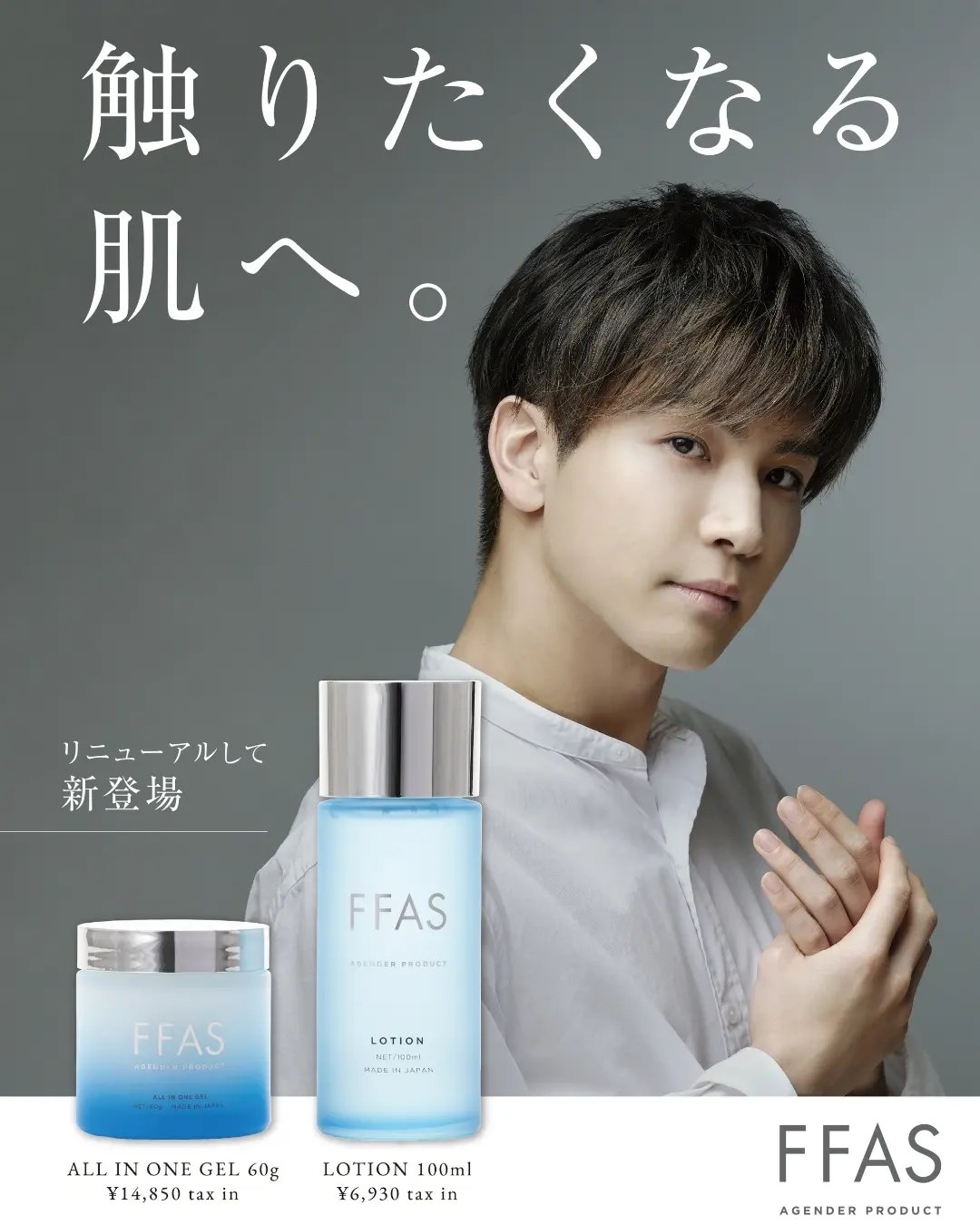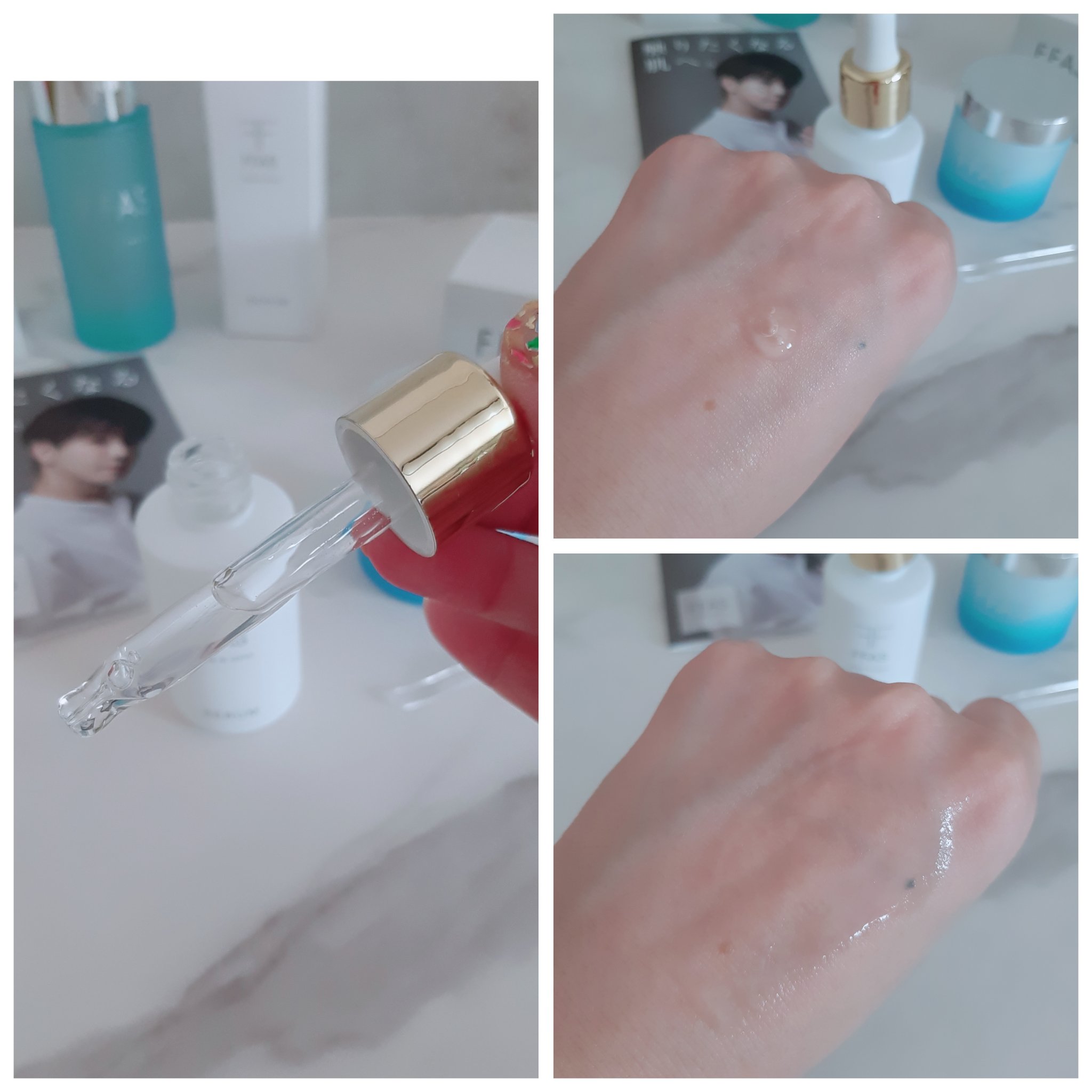 *ALL IN ONE GEL ----------------化粧水・美容液・乳液・クリームの成分が一つに!男性にも使いやすい、さらりとしたテクスチャーで、パートナーと共有できるユニセックス仕様です。 *MOIST LOTION-------------------みずみずしい透明のジェル状化粧水は、粘度の高いテクスチャーでしっかり保湿。べたつかないのに、うるおいが長続きします。 *SERUM --------------------------水をコラーゲン水で最大限(74.854%) 代替した濃密美容液。FFASシリーズの中でも、特別贅沢な処方だそうです。とろみがあるテクスチャーでハンドプレスすると吸い付くような心地です。