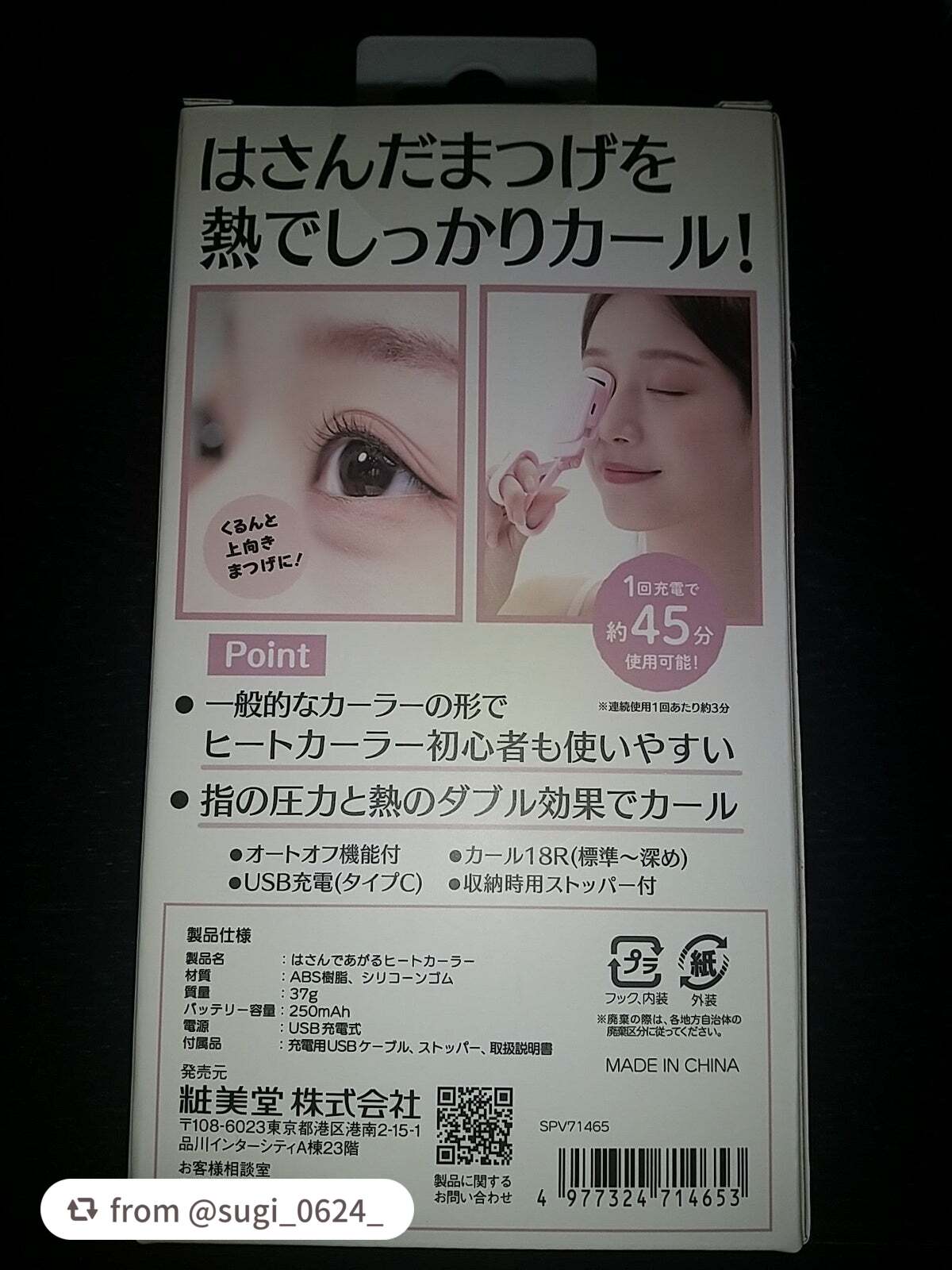 - はさんだまつげを熱でしっかりカール。 一般的なカーラーの形でヒートカーラー初心者の方にも使いやすい仕様です。 指の力と熱のダブル効果でまつげがしっかり上がります。 また、本商品はUSB充電式で、1回の充電で約45分使用可能です。 オートオフ機能付なので消し忘れの心配もありません。