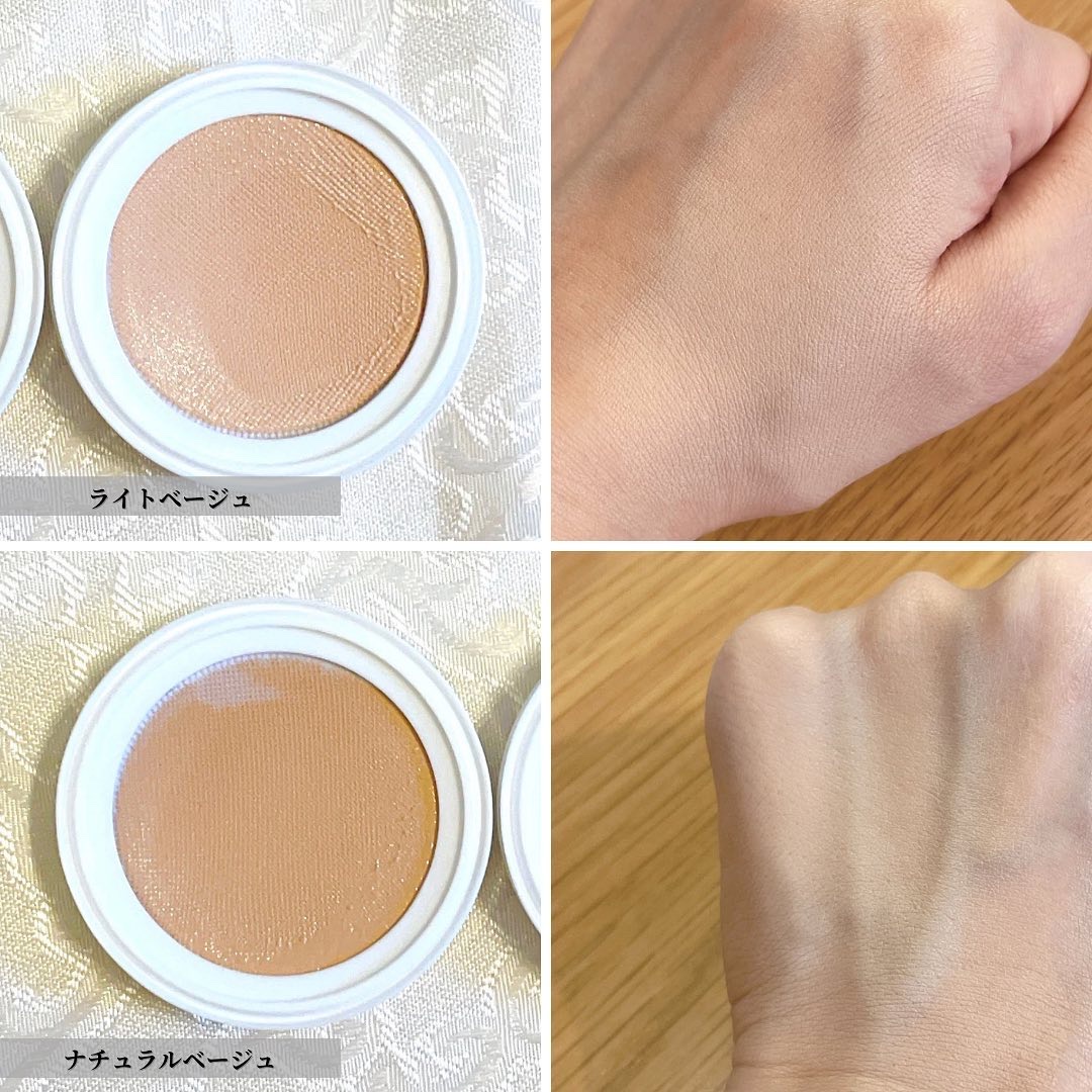 チークの色比較は3枚目から5枚目にあるので是非見てみて😍 細かいパール入りのツヤ肌系と、フィルターがかかったようなサラッとした肌になる2タイプの粉質なんだけど、私の好みはツヤ肌系かなぁ…🤔 ファンデの方は、うるおいのあるツヤ肌系で、軽く密着する感じで長時間崩れにくい💡 保湿成分配合だから乾燥肌さんに特におすすめ! ピンクベージュベースのカラーなので肌馴染みも良く、自然な透明感を演出してくれます😌✨ コンパクトがキラキラで可愛いのもテンション上がるポイント🥺❣️