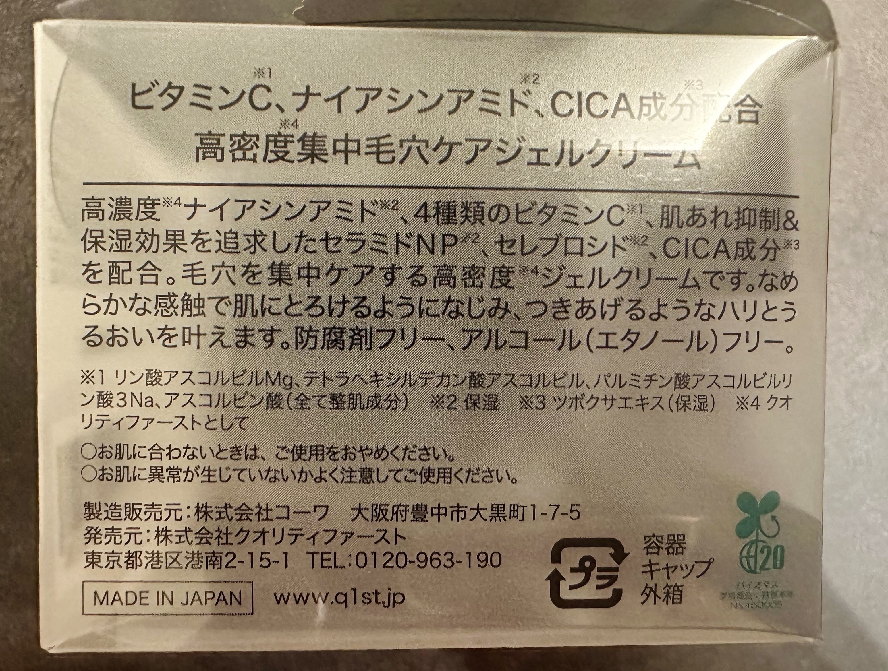 - 毛穴ケアと肌荒れを防ぐジェルクリームが登場。 高濃度*ナイアシンアミド**、4種類のビタミンC**、肌荒れ防止&保湿効果のセラミド**、セレブロシド**、CICA成分(ツボクサエキス**)の合わせ技で、美肌へ集中ケア。なめらかな感触で肌にとろけるようになじみ、肌の角質層からつきあげるようなハリとうるおいを与えます。 肌のことを考え抜いた防腐剤フリー、アルコール(エタノール)フリーです。 *クオリティファーストとして **保湿成分