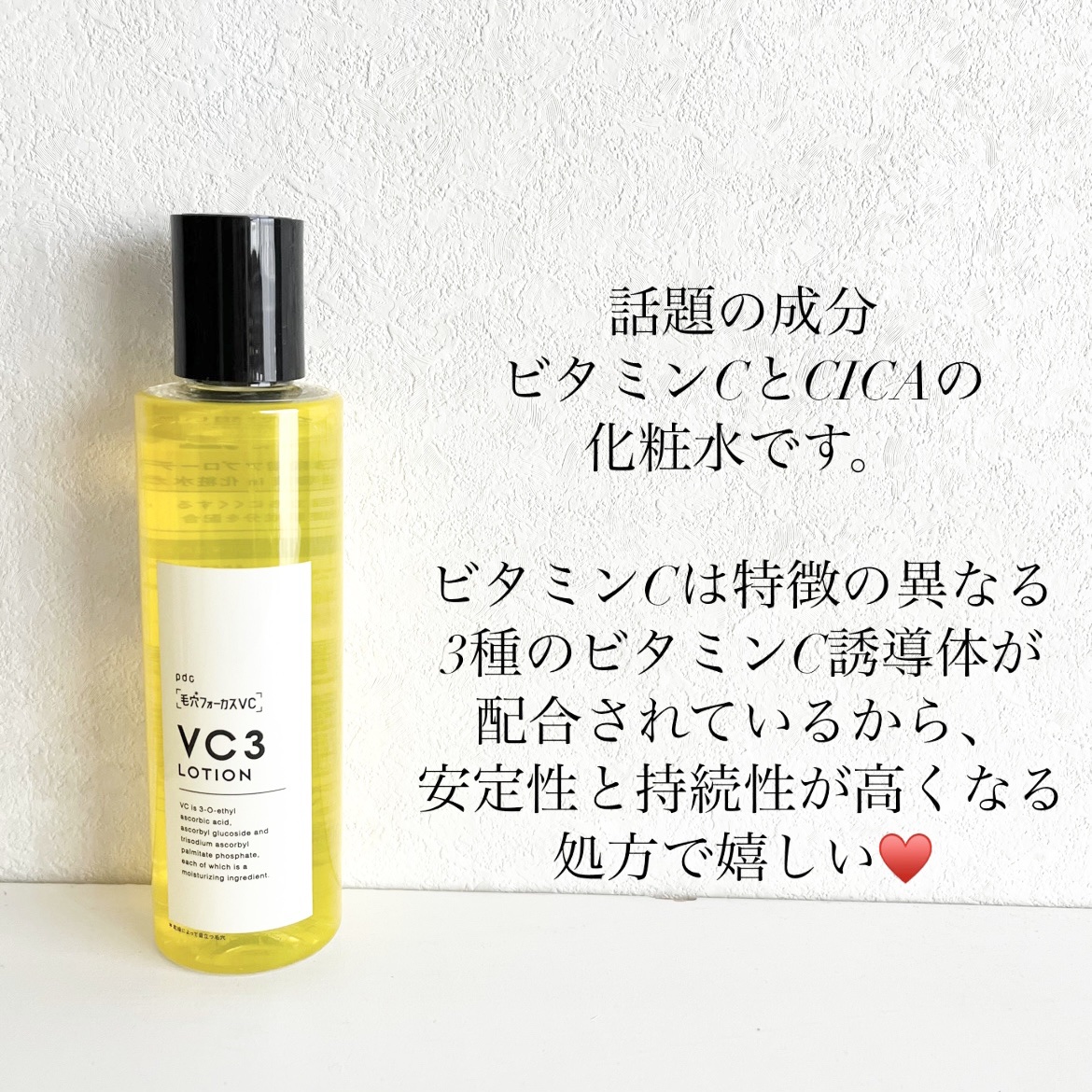 - 特徴が異なる3種類のビタミンC誘導体※1・2・3と、角層を整えるCICA(ツボクサエキス 整肌成分)を配合した、角質柔軟美容液inの毛穴*対策ビタミンC化粧水。* 乾燥によって目立つ毛穴※1 3-O-エチルアスコルビン酸(保湿成分)※2 アスコルビルグルコシド(保湿成分)※3 パルミチン酸アスコルビルリン酸3Na(保湿成分)