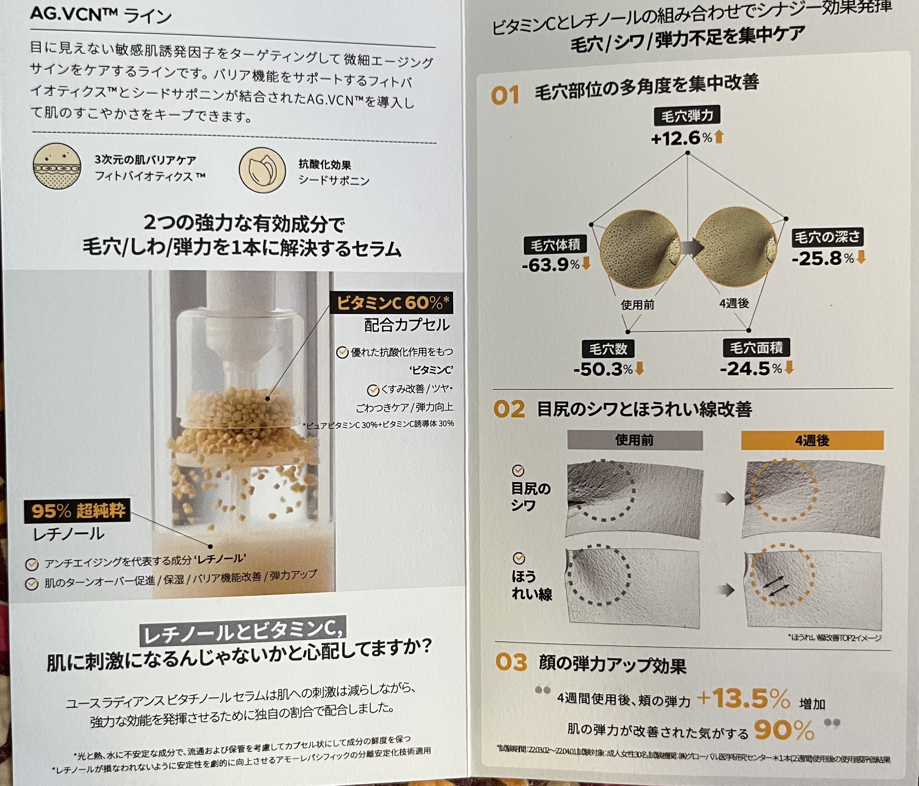 - ビタミンC*¹×レチノール*²の革新的*3な組み合わせで 毛穴・くすみ*4をケアし、毛穴レス印象肌*⁵へ マイルドな処方で朝晩使えるデイリーセラム *¹ アスコルビン酸、3-O-エチルアスコルビン酸(整肌保湿成分) *² 整肌成分 *³ 当社比 *⁴乾燥による *⁵ 肌にうるおいを与え、乾燥により目立った毛穴を目立たなくすること