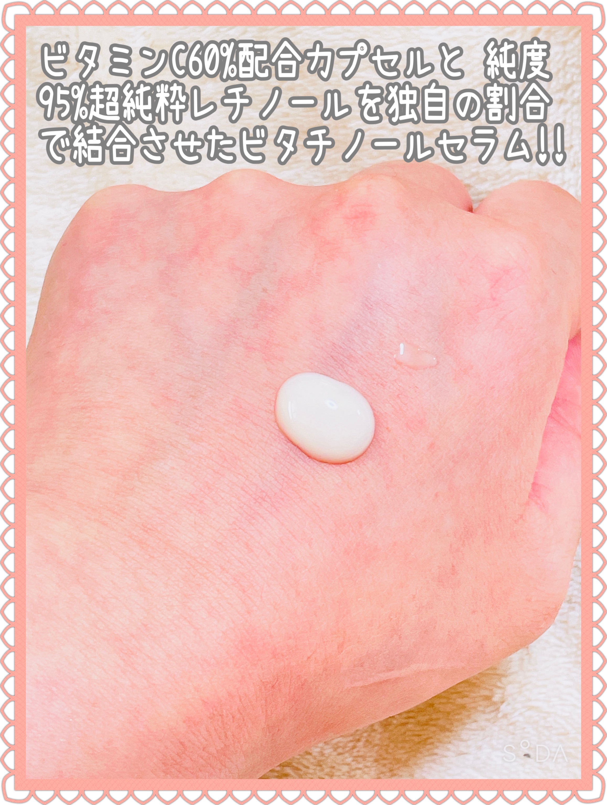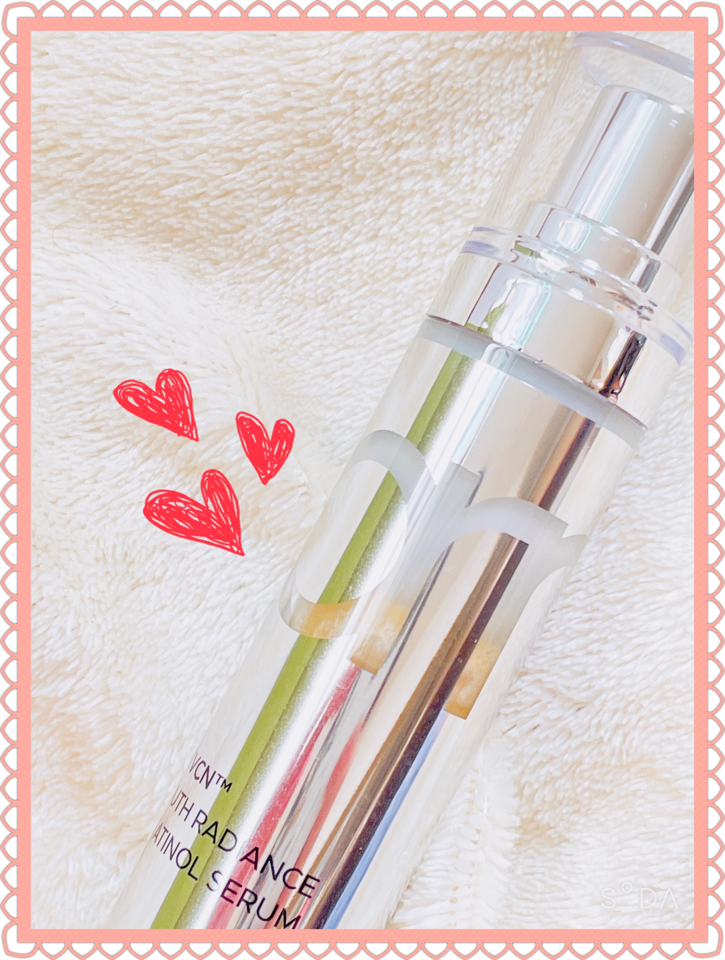 シルバーのボトルは、とってもオシャレ カプセルパートとセラムパートで分かれているのでふたを開け、カチッと音がするまでポンプを押し、最初に使用するときは、カプセルが溶けてセラムとよく混ざるように30秒以上、上下に振り、5分ほど立てておき、お肌になじませます。 ビタミンC+レチノールを実現したセラムはビタミンCカプセルとピュアレチノールの革新的な組み合わせで、毛穴や弾力などの肌の状態をケアし、健康的で美しい肌へと導くことができます。 やっぱり、別々に使ってたビタミンCとレチノールが一緒に使えるのはうれしい!
