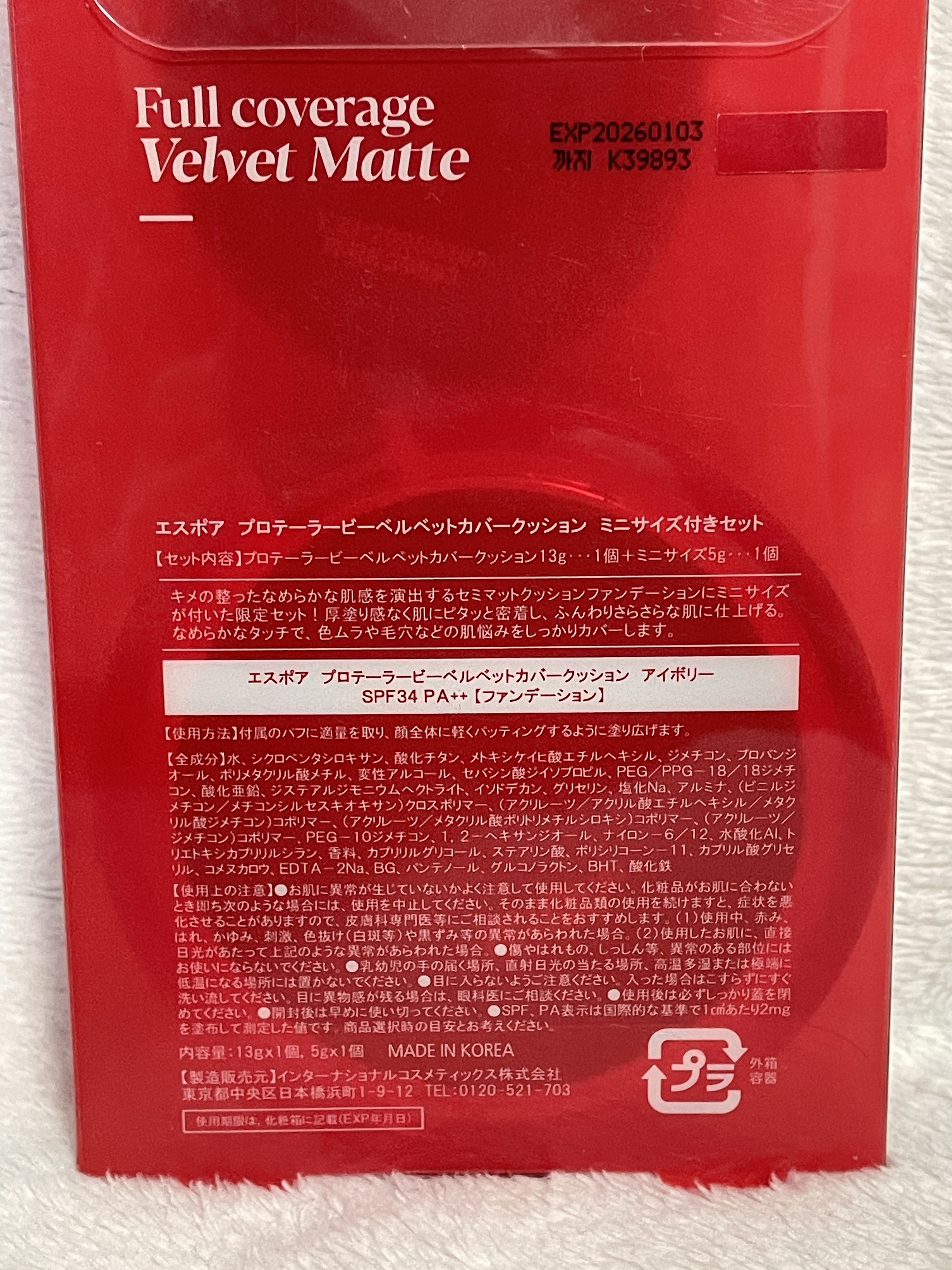 - <20 バニラ> 酸化亜鉛、水、酸化チタン、BG、グリセリン、ジメチコン、香料、水酸化Al、酸化鉄、メトキシケイヒ酸エチルヘキシル、アルミナ、ステアリン酸、プロパンジオール、カプリリルグリコール、トリエトキシカプリリルシラン、イソドデカン、シクロペンタシロキサン、ジステアルジモニウムヘクトライト、PEG/PPG-18/18ジメチコン、カプリル酸グリセリル、パンテノール、PEG-10ジメチコン、1,2-ヘキサンジオール、EDTA-2Na、BHT、塩化Na、ポリシリコーン-11、ポリメタクリル酸メチル、コメヌカロウ、変性アルコール、(ビニルジメチコン/メチコンシルセスキオキサン)クロスポリマー、グルコノラクトン、セバシン酸ジイソプロピル、(アクリレーツ/ジメチコン)コポリマー、(アクリレーツ/メタクリル酸ポリトリメチルシロキシ)コポリマー、(アクリレーツ/アクリル酸エチルヘキシル/メタクリル酸ジメチコン)コポリマー、ナイロン-6/12 <23 ベージュ> 酸化亜鉛、水、酸化チタン、BG、グリセリン、ジメチコン、香料、水酸化Al、酸化鉄、メトキシケイヒ酸エチルヘキシル、アルミナ、ステアリン酸、プロパンジオール、カプリリルグリコール、トリエトキシカプリリルシラン、イソドデカン、シクロペンタシロキサン、ジステアルジモニウムヘクトライト、PEG/PPG-18/18ジメチコン、カプリル酸グリセリル、パンテノール、PEG-10ジメチコン、1,2-ヘキサンジオール、EDTA-2Na、BHT、塩化Na、ポリシリコーン-11、ポリメタクリル酸メチル、コメヌカロウ、変性アルコール、(ビニルジメチコン/メチコンシルセスキオキサン)クロスポリマー、グルコノラクトン、セバシン酸ジイソプロピル、(アクリレーツ/ジメチコン)コポリマー、(アクリレーツ/メタクリル酸ポリトリメチルシロキシ)コポリマー、(アクリレーツ/アクリル酸エチルヘキシル/メタクリル酸ジメチコン)コポリマー、ナイロン-6/12
