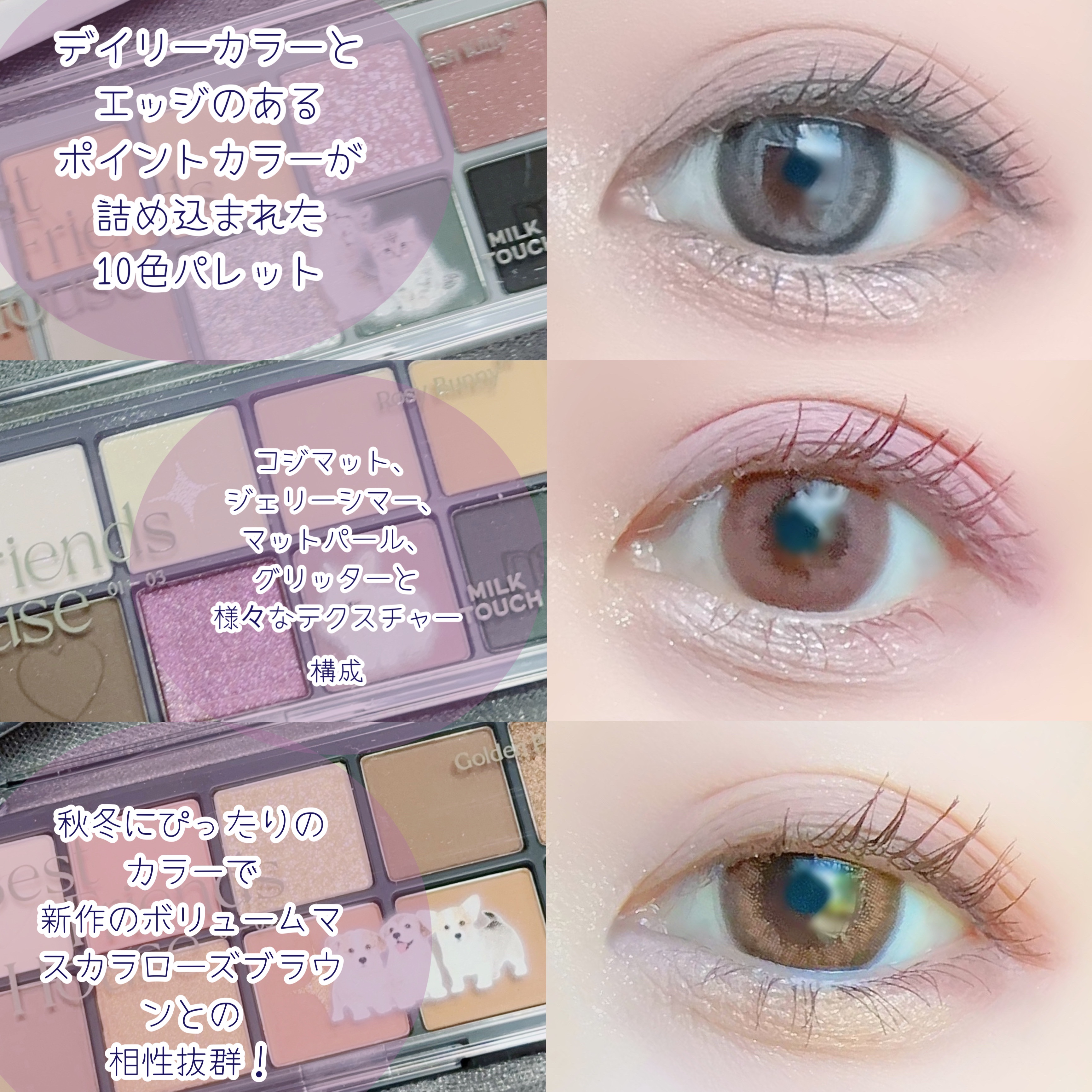 - ”シック”で愛らしくて”可愛いマイペット” 韓国でトレンドのスモーキーメイクがこのパレット1つで叶う、10色パレット。マット、シマー、グリッターなど多様な質感が揃い夢中になる魅力的なカラーに柔らかいタッチ感。 デイリーカラー+エッジのあるポイントカラーを一つのパレットに詰め込みました。