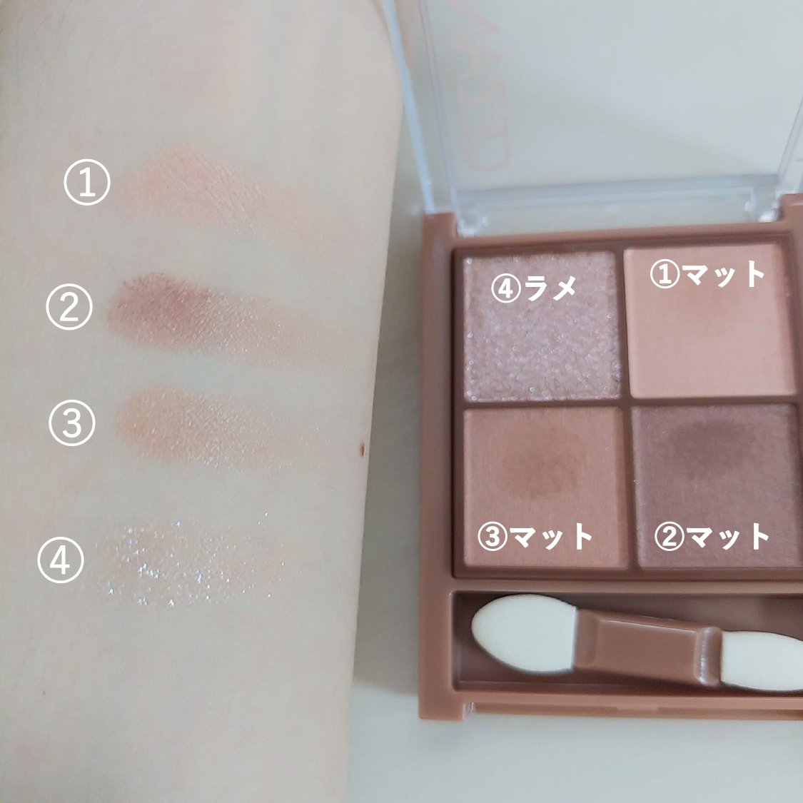 - 透け感マット×濃厚ブラウンの4色アイシャドウ。 しっかり目元を引き締めるビターなブラウンカラー。 透け感のあるブラウンを重ねて、自然な陰影のある目元へ。 ふんわり柔らかなパウダーなので、スルスル伸びてまぶたにピタッと密着。 保湿成分(スクワラン、ホホバ種子油)配合。