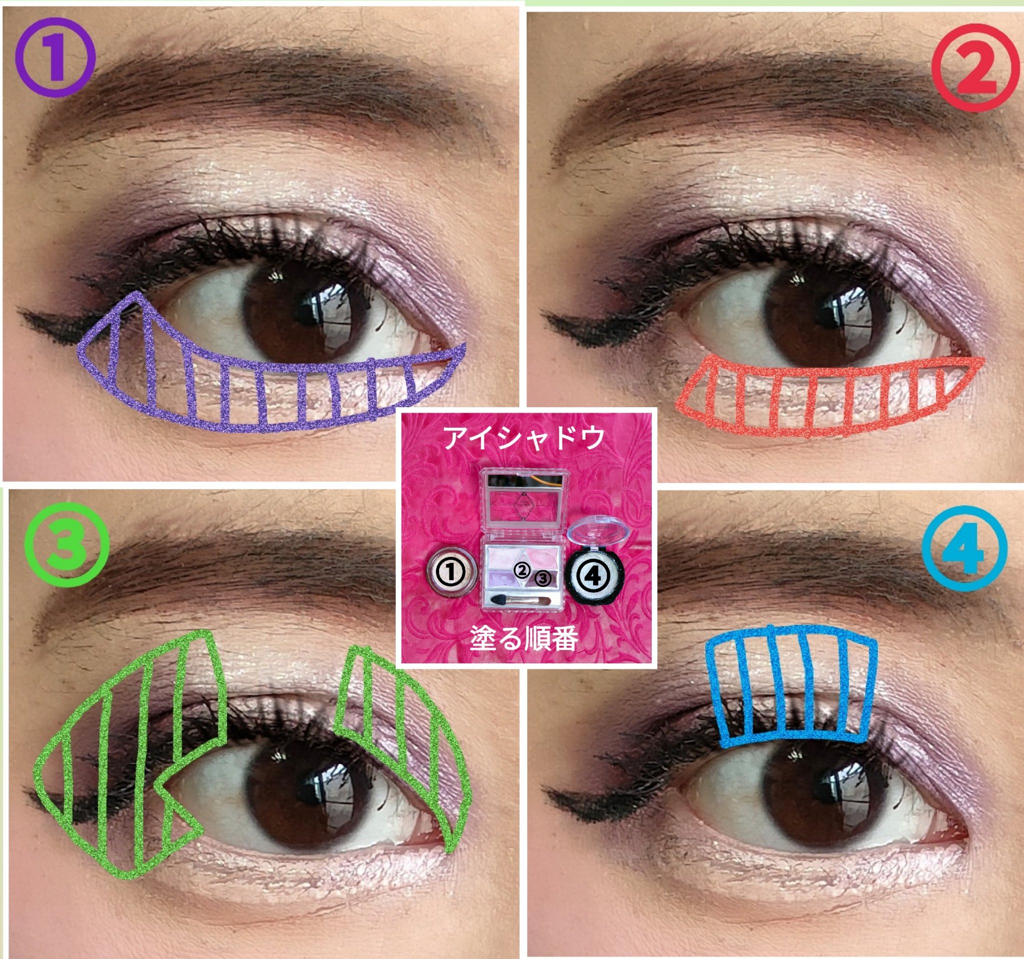 アイシャドウパレットは、UR GLAM アイシャドウパレットを、使用しました。 リップは、M・A・C リップスティック ピーチストックを、唇全体にまんべんなく塗ります。