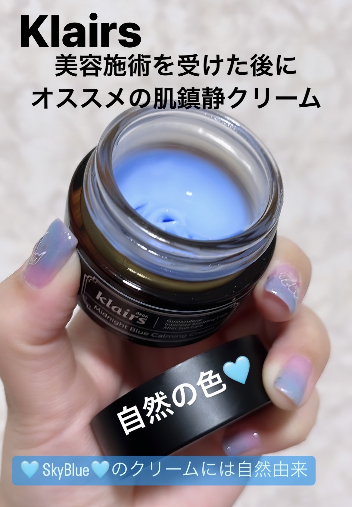 青い美容液&クリーム!!Klairsミッドナイトブルーユースアクティベーティングドロップ🌸ミッドナイトブルーカーミングクリーム青いのは着色料ではなく、植物成分の天然原料グアイアズレンが含まれているから💡グアイアズレンとは、炎症を抑える医薬品に...