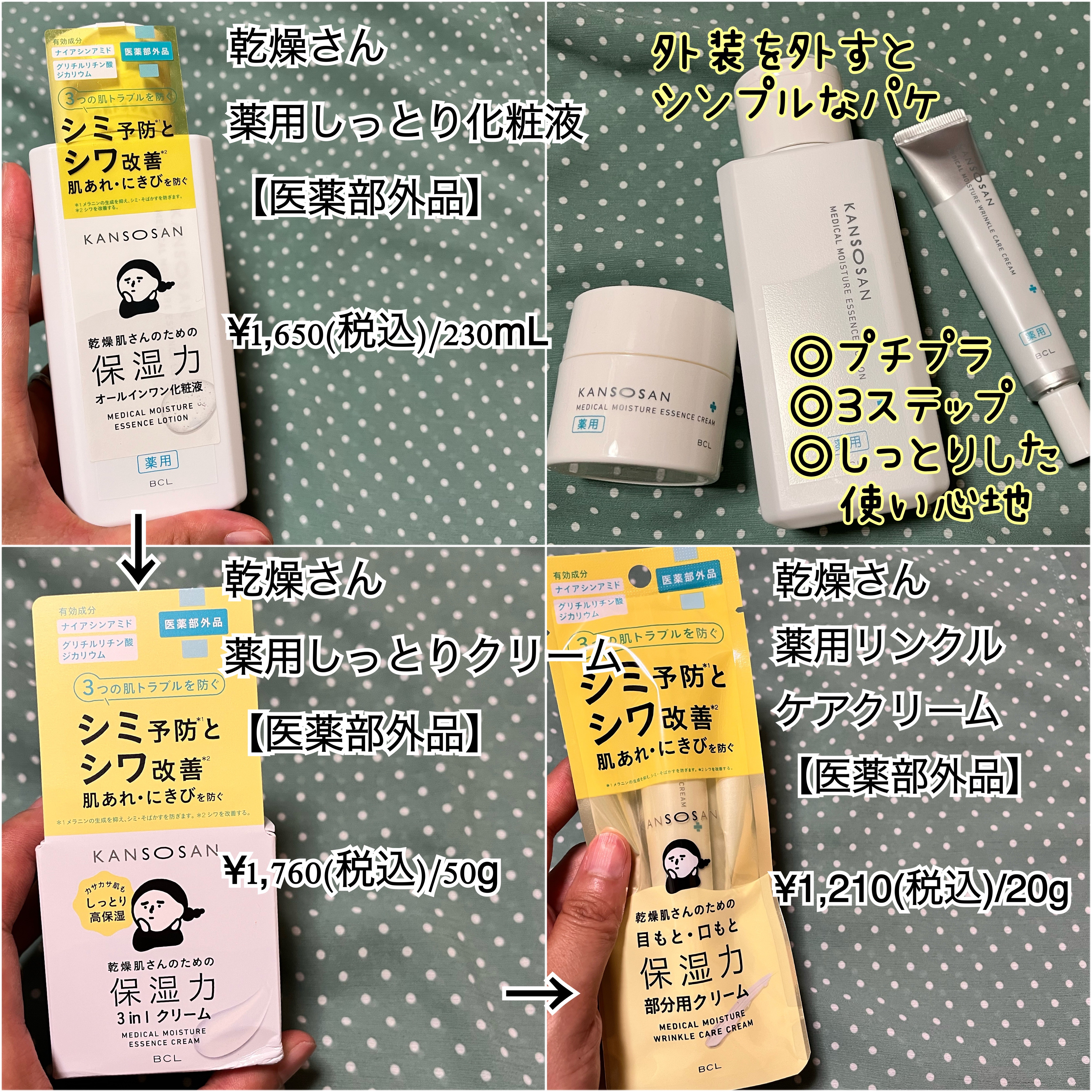 こちらの“乾燥さんメディカルシリーズ”は ♢シミ予防 ♢シワ改善 ♢肌あれ.にきびを防ぐという3つの肌トラブルに着目したスキンケアです 有効成分であるナイアシンアミドとグリチルリチル酸ジカリウムがメラニンの生成を抑制しシミやソバカスを防いだり、シワの改善やニキビを防ぎます なんと1本で「化粧水」「美容液」「乳液」のオールインワン!とろんとしたテクスチャーでホンッとにしっとりで手のひらが肌に吸い付く感じです