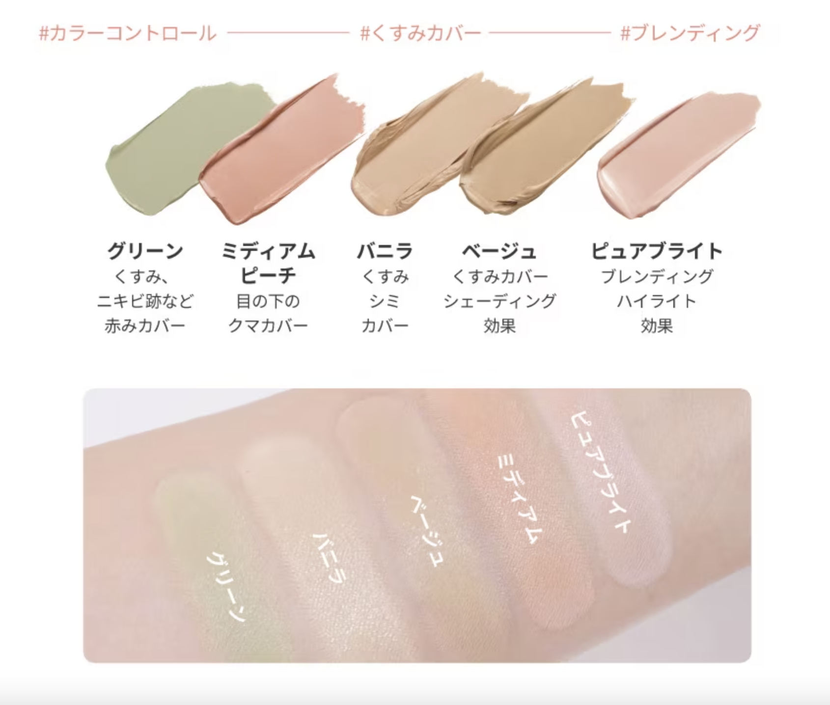 一つのパレットでカバーからカラーコントロールまで! 色んな肌悩みにアプローチする5色のカラーでコスパ最強のコンシーラーパレット 今回使用した1号クリアカバーはイエベ・ニュートラルの方におすすめ! クリーミーなテクスチャーで密着力が高く肌に馴染むのでよれない