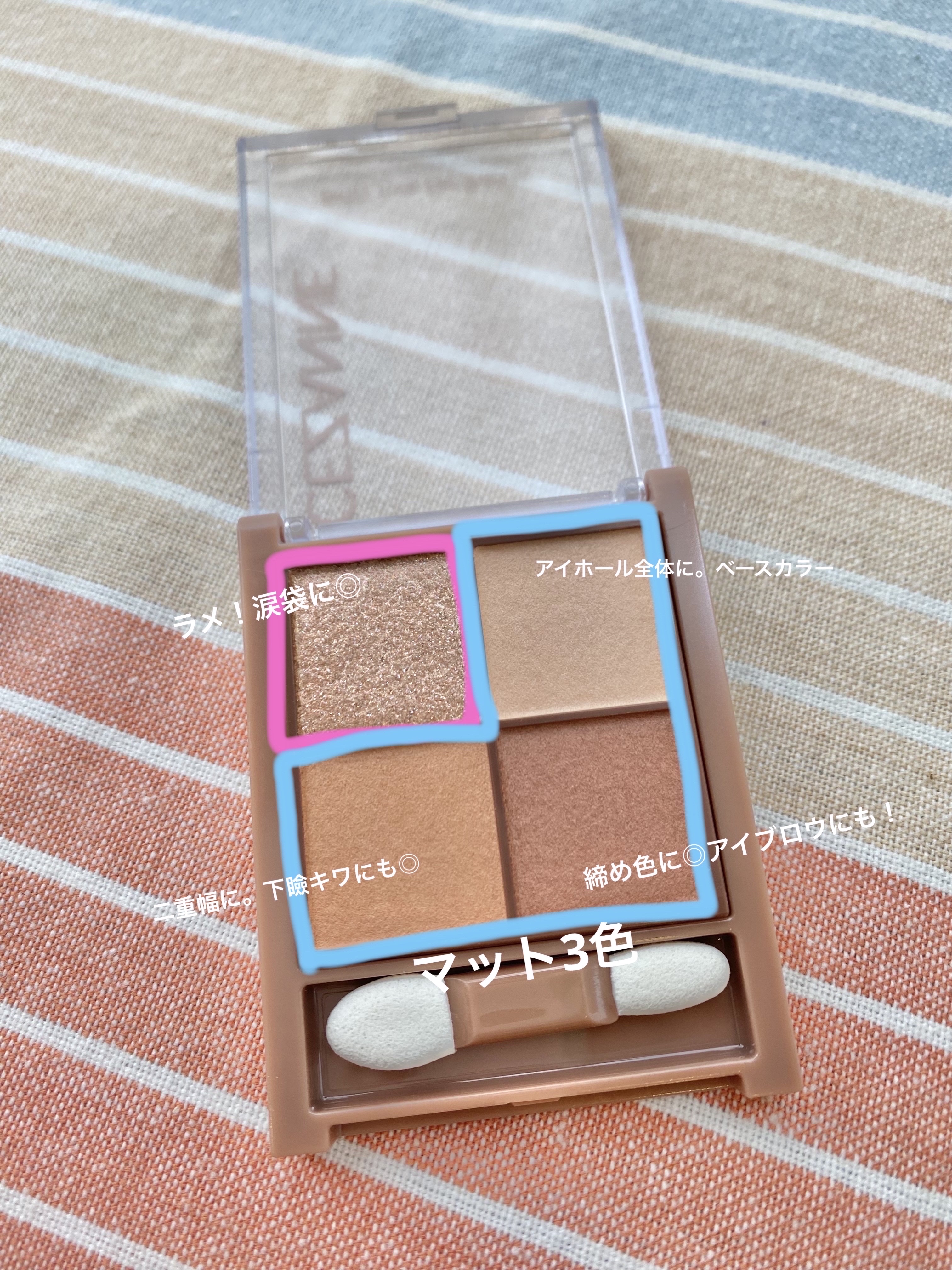 - 透け感マット×濃厚ブラウンの4色アイシャドウ。 しっかり目元を引き締めるビターなブラウンカラー。 透け感のあるブラウンを重ねて、自然な陰影のある目元へ。 ふんわり柔らかなパウダーなので、スルスル伸びてまぶたにピタッと密着。 保湿成分(スクワラン、ホホバ種子油)配合。