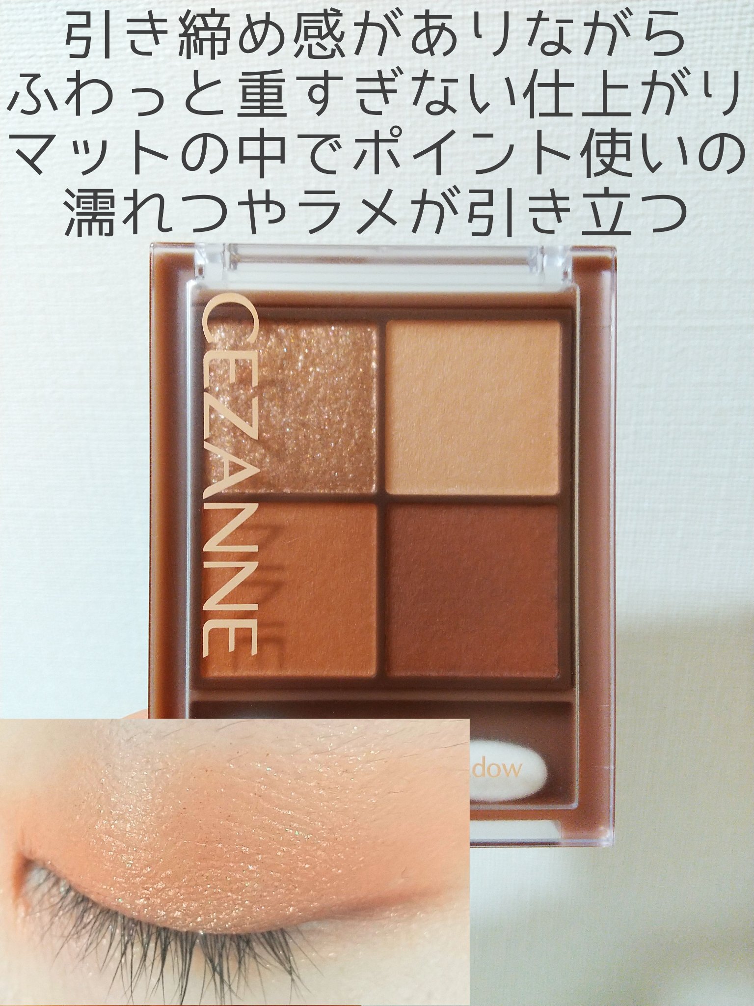 - 透け感マット×濃厚ブラウンの4色アイシャドウ。 しっかり目元を引き締めるビターなブラウンカラー。 透け感のあるブラウンを重ねて、自然な陰影のある目元へ。 ふんわり柔らかなパウダーなので、スルスル伸びてまぶたにピタッと密着。 保湿成分(スクワラン、ホホバ種子油)配合。