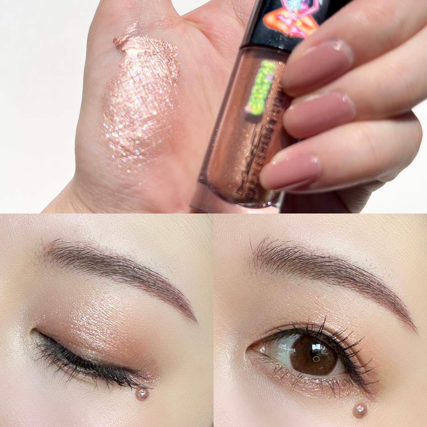 手に試した感じではベースのブルーは弱く、ラメ自体がブルーで可愛すぎる…! BAさんはパウダーアイシャドウのベースにもおすすめと教えてくれたので、 今日はこちらをベースにピンクブラウン系の アイシャドウを使ってメイクしてみたよ🫶🏻 肌に伸ばすとすぐにサラサラになるから ベタベタが残ったりしないし、 パウダーアイシャドウの上に重ねてもヨレない◎