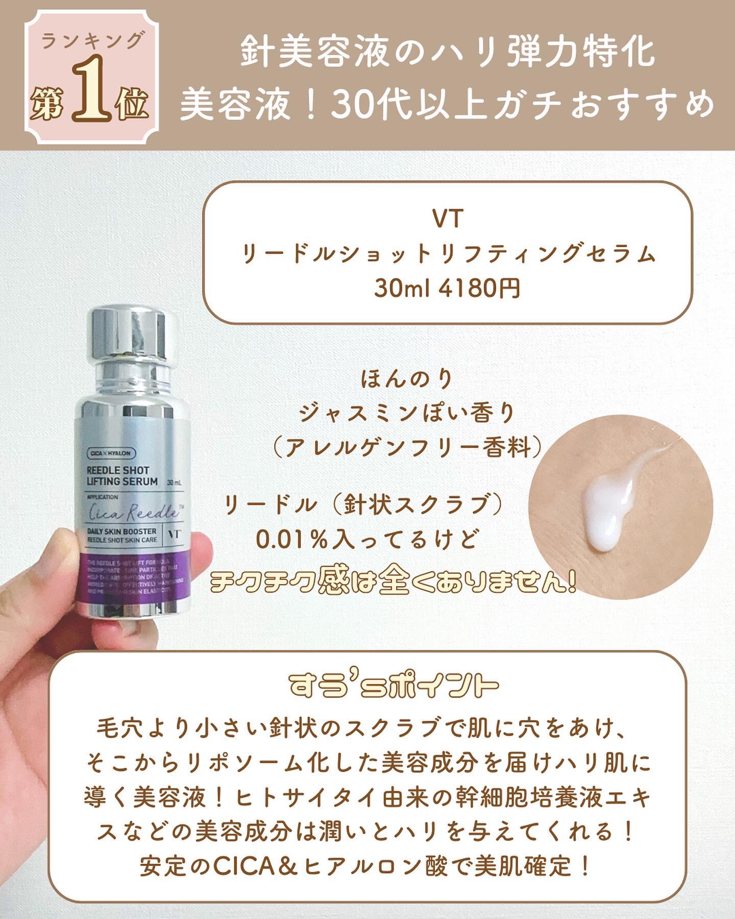 VT リードルショット100 50ml 4720円 針の量で100・300・700 公式サイトでは同ブランドのコラーゲンとレチノール製品との併用をおすすめしていました!持ってるので使ってみましたが感動致しました。