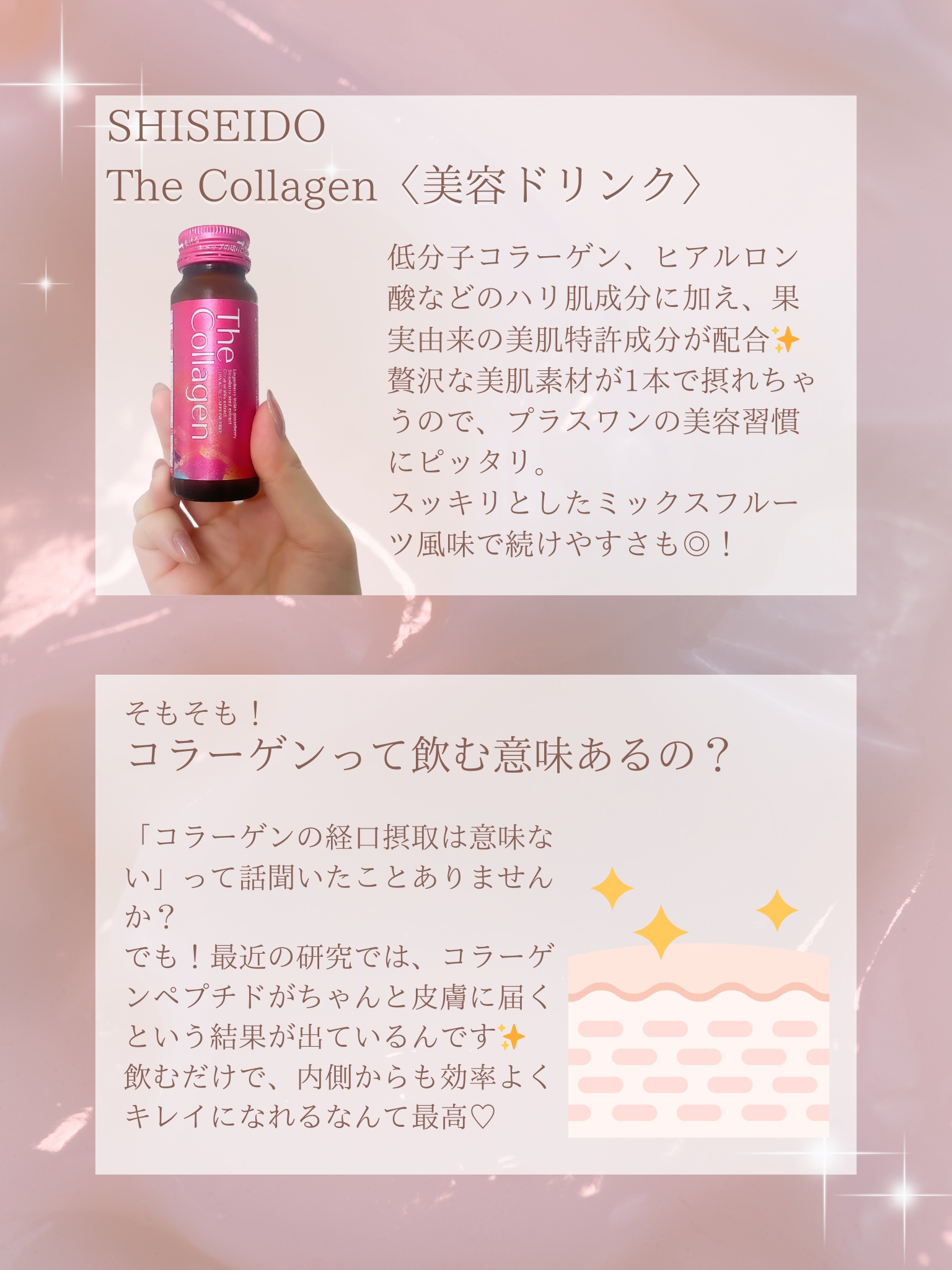 10種の美容成分を厳選配合の美容ドリンクだよ😊 スーパー果実由来の美容特許成分(コケモモ+アムラ果実)に加え、トマト種子エキス、桜の花エキス、GABA、クロセチン、低分子コラーゲン、ヒアルロン酸、セラミド、ビタミンCを配合💓 低カロリー・ノンカフェイン・脂質ゼロ⭕️ ミックスフルーツ風味で飲みやすいんだ😍