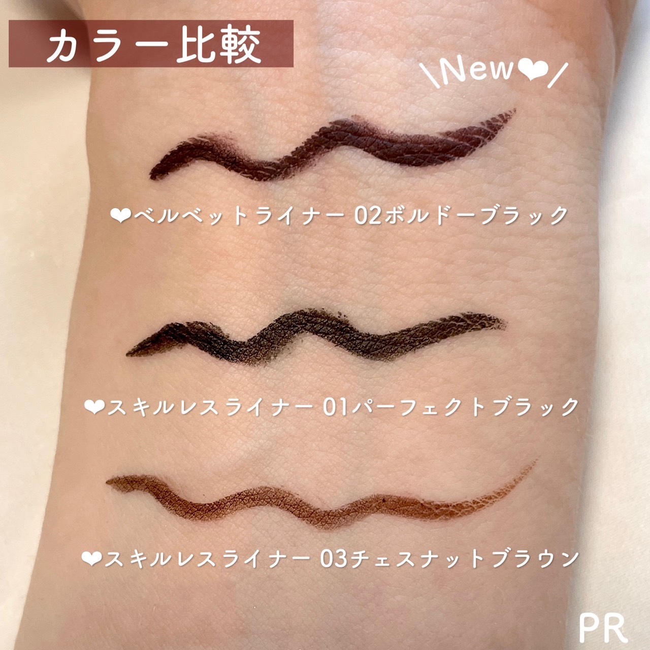 LUMIURGLASベルベットライナー02ボルドーブラックスキルレスライナーが大好きなので、こちらも購入してみました。3枚目がスモアグレージュとの比較画像なのですが、スキルレスライナーの方が艶感や透け感があるなぁと感じました。対してベルベット...